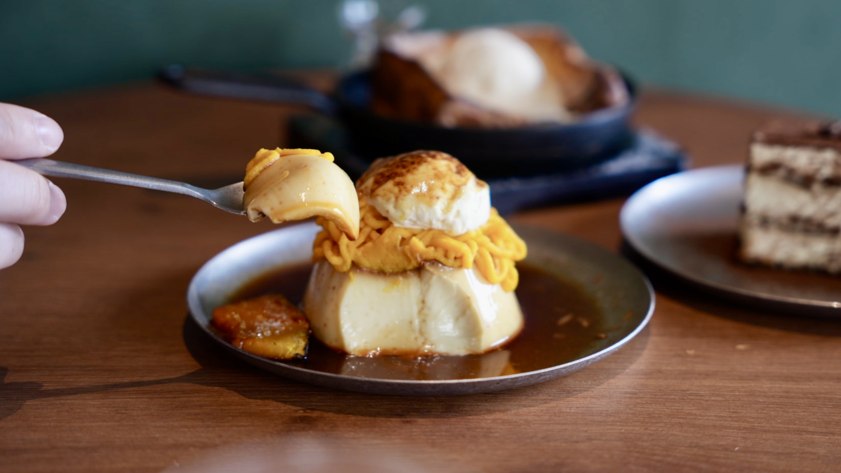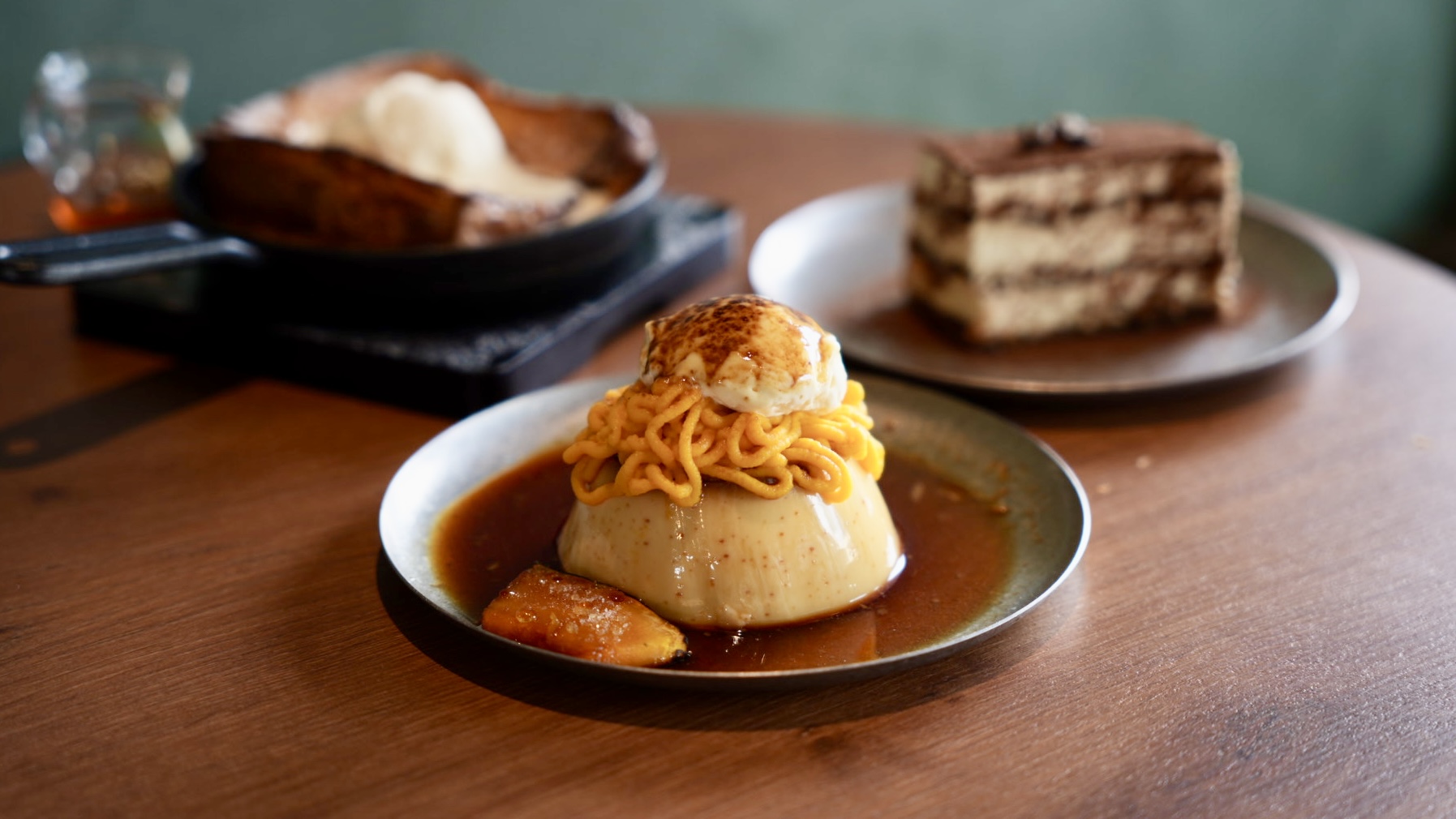 除了鐵板吐司,我也很推薦他們家的「日和布丁」,布丁上面擠上南瓜泥、鮮奶油,布丁滑嫩綿密在口中化開,蛋奶香氣很濃厚~是好吃的日式布丁唷!