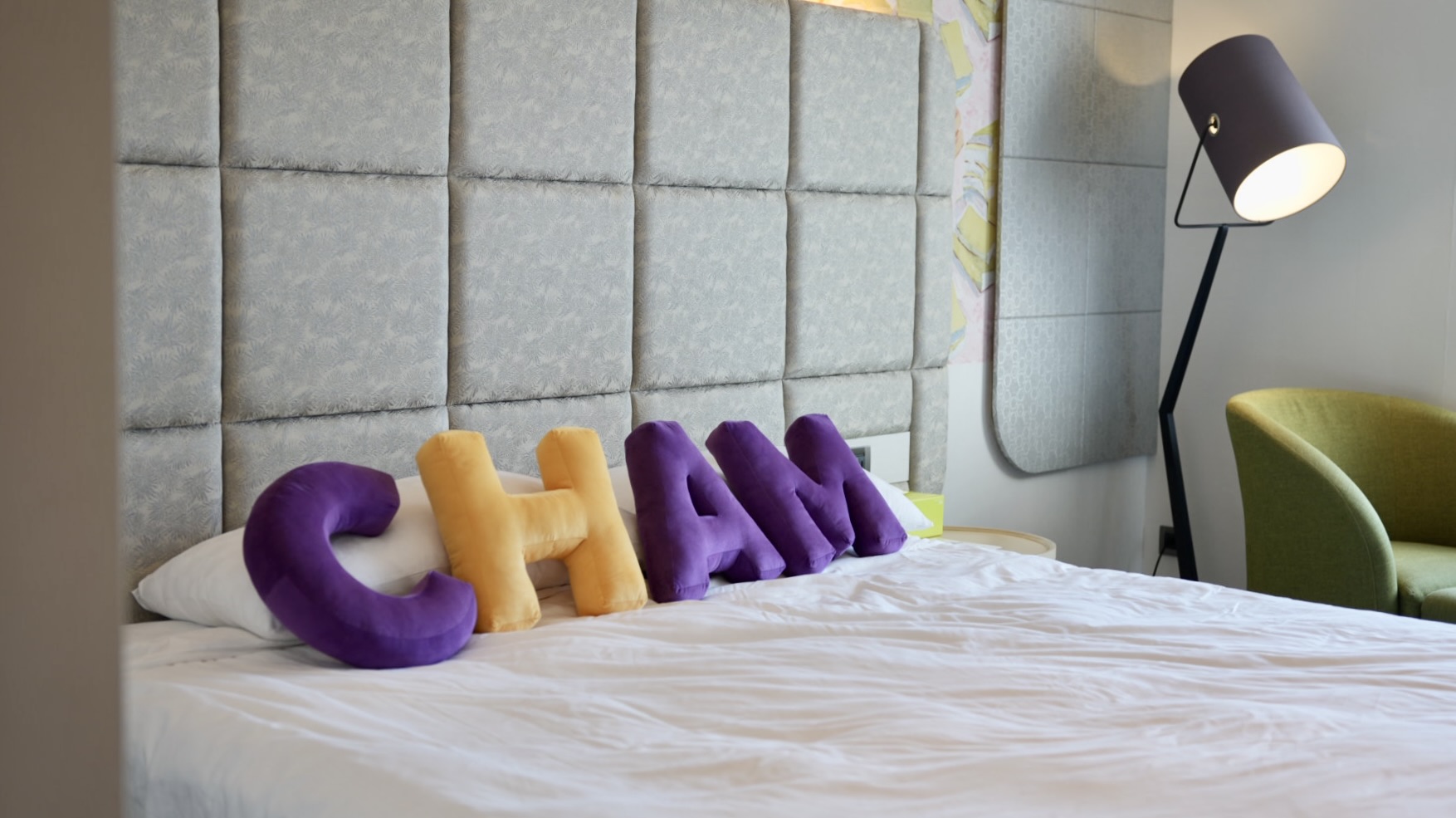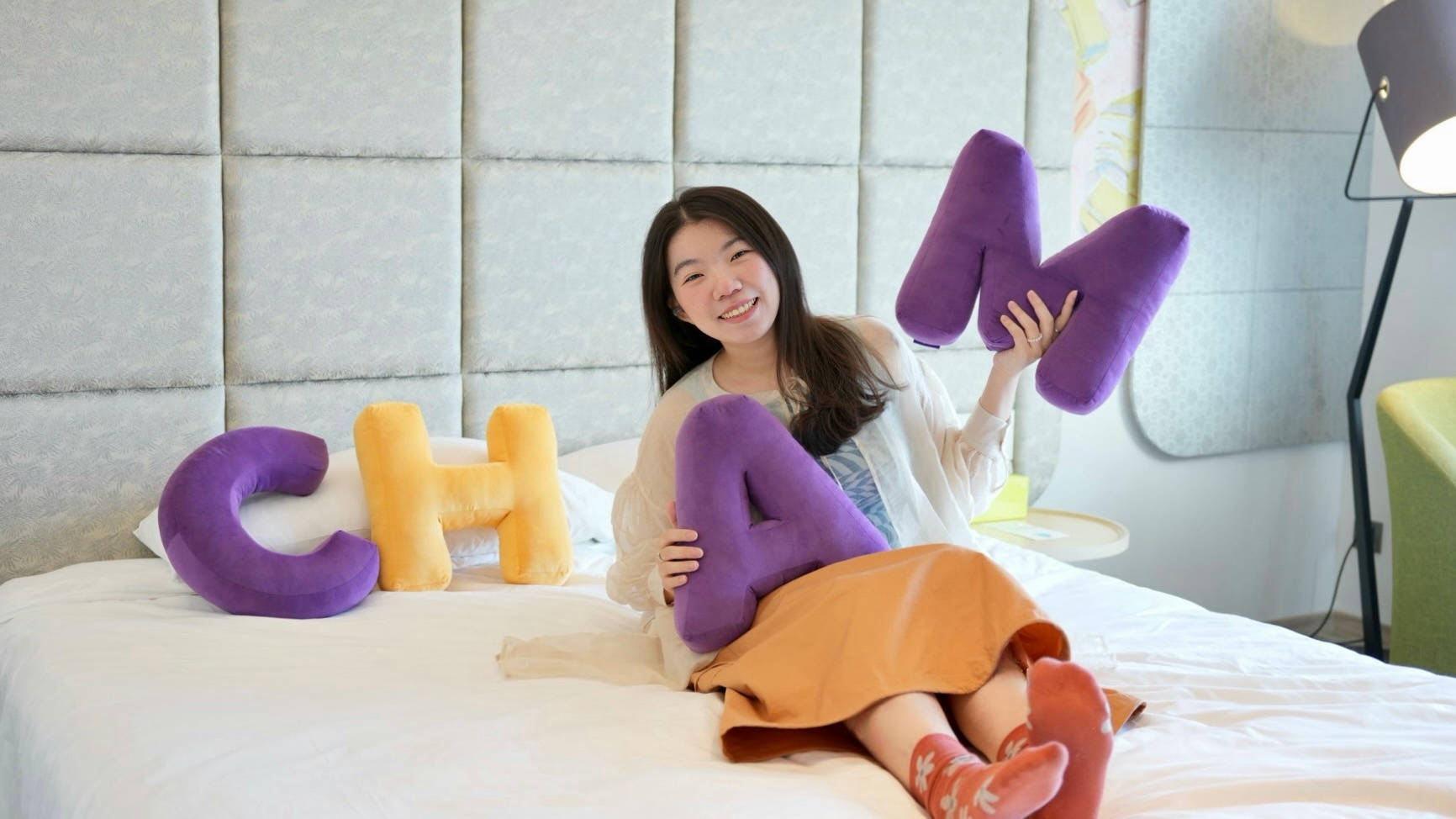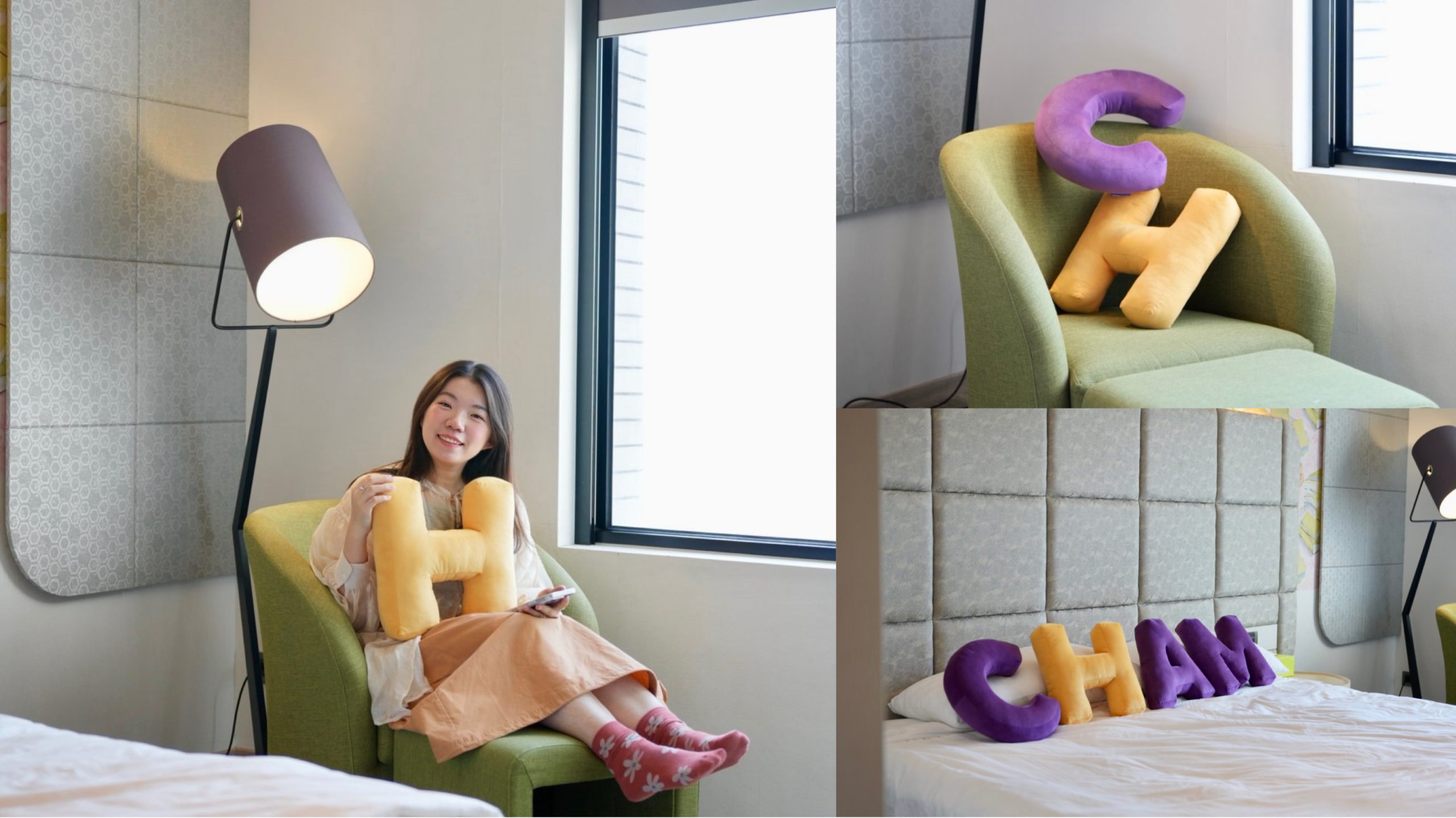 超級喜歡品牌英文的抱枕,品牌色調顏色好可愛,黃色紫色真的活力滿滿,喜歡拍照的女孩們,可以跟可愛的字母抱枕拍照,很有設計感~拍起來好好看!