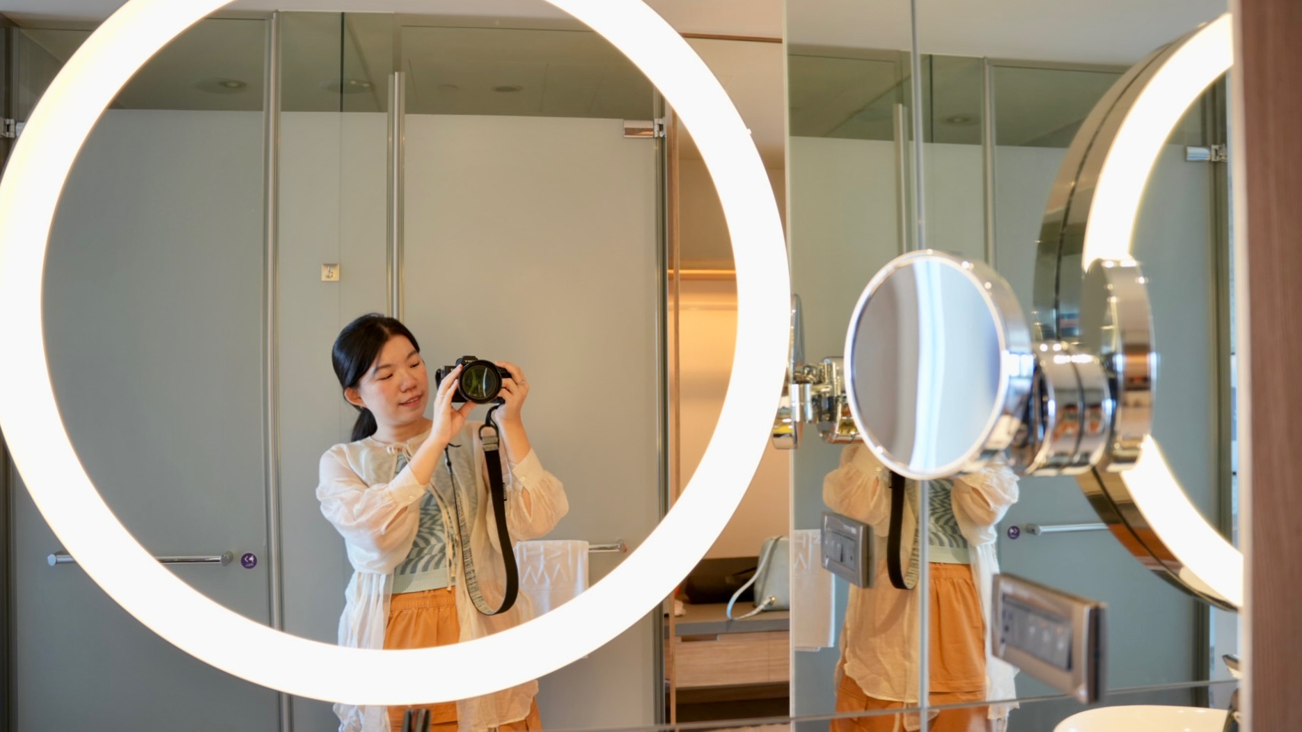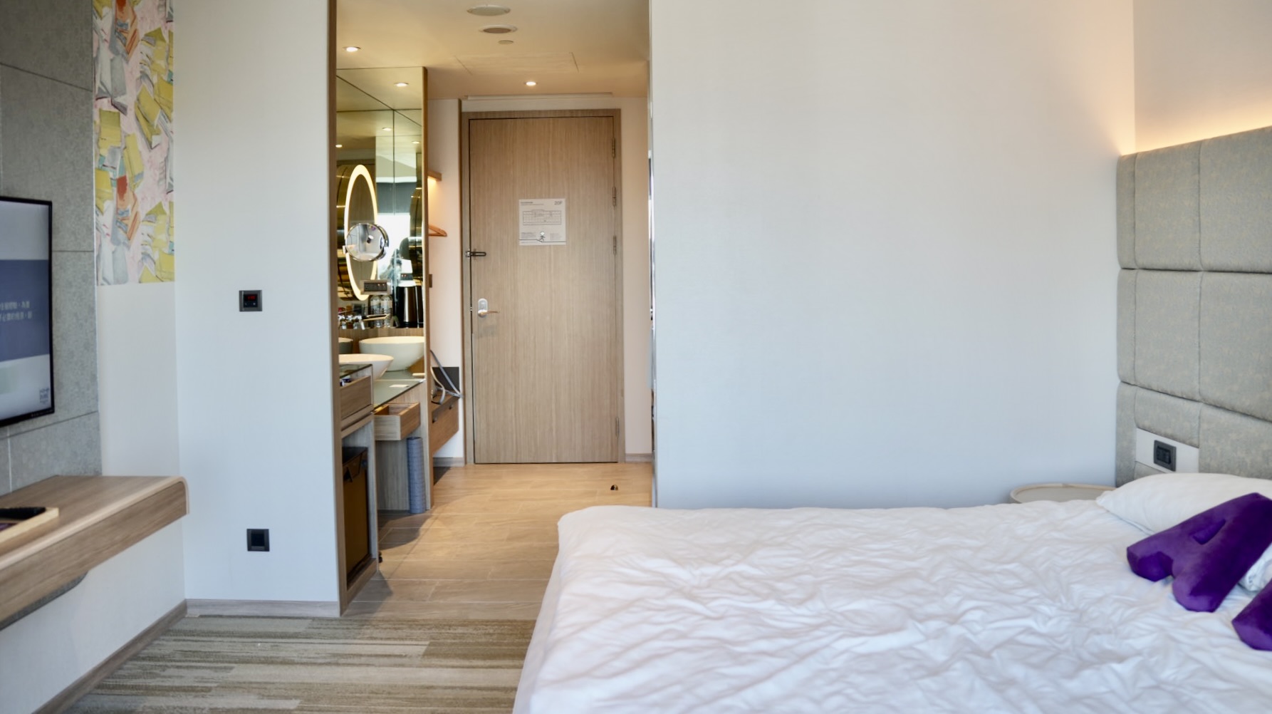 我們今天入住的房型是「探索客房」一大床的房型,一進門會先看到右手邊有一個放行李的空間,接著旁邊是開放式的洗手台、超大的化妝鏡,左手邊是乾濕分離的衛浴設備,有浴缸、淋浴、免治馬桶,房間空間約8坪,整體感受很寬敞,走到空間很大可以放很多行李箱沒問題!