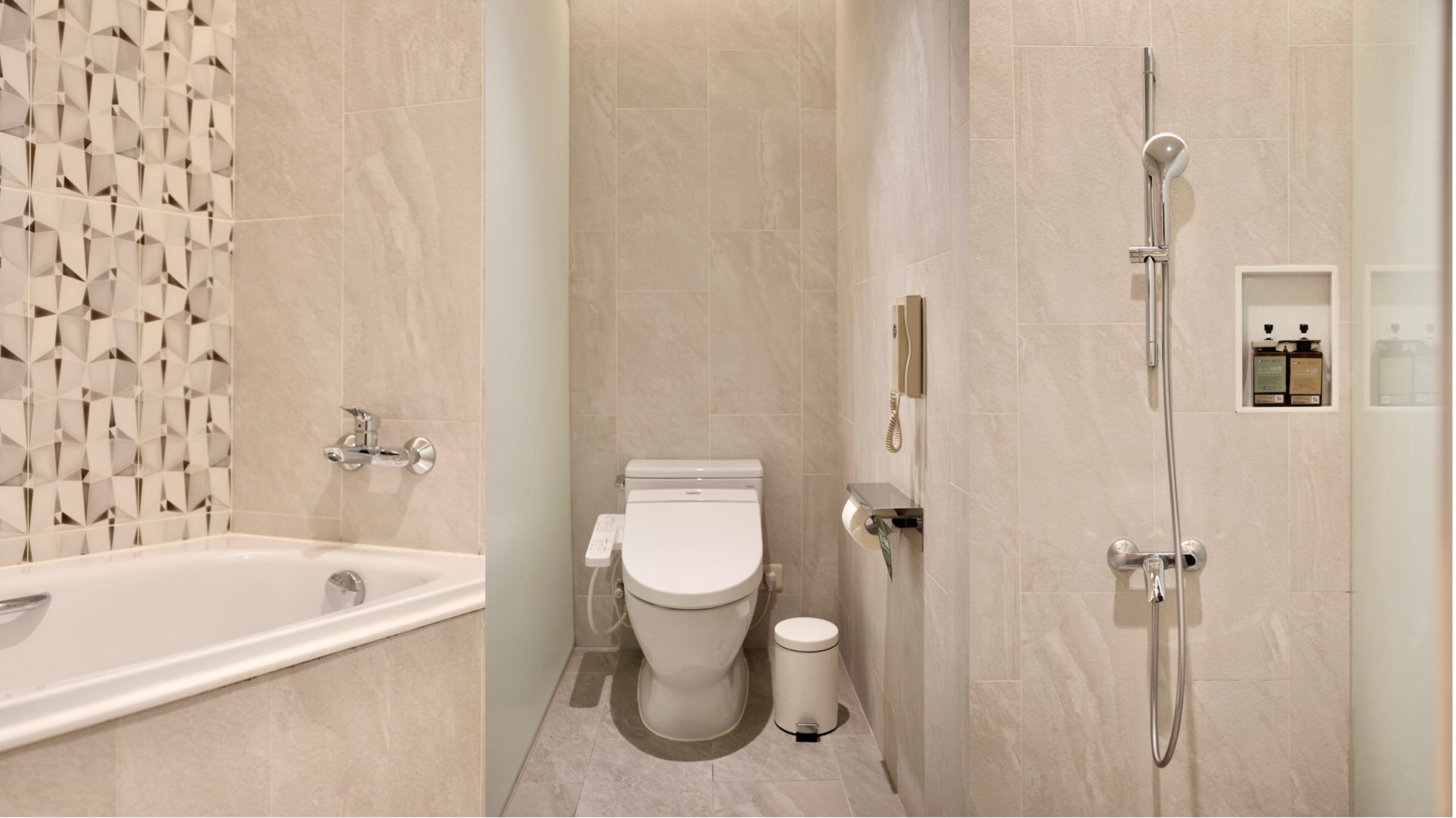 衛浴設備是乾濕分離,像日本一樣的設計,獨立的廁所空間,上廁所和洗澡的人不用搶,一人一間剛剛好,廁所馬桶是免治馬桶,淋浴空間就在浴缸旁邊,可以泡完澡走出來淋浴洗澡。