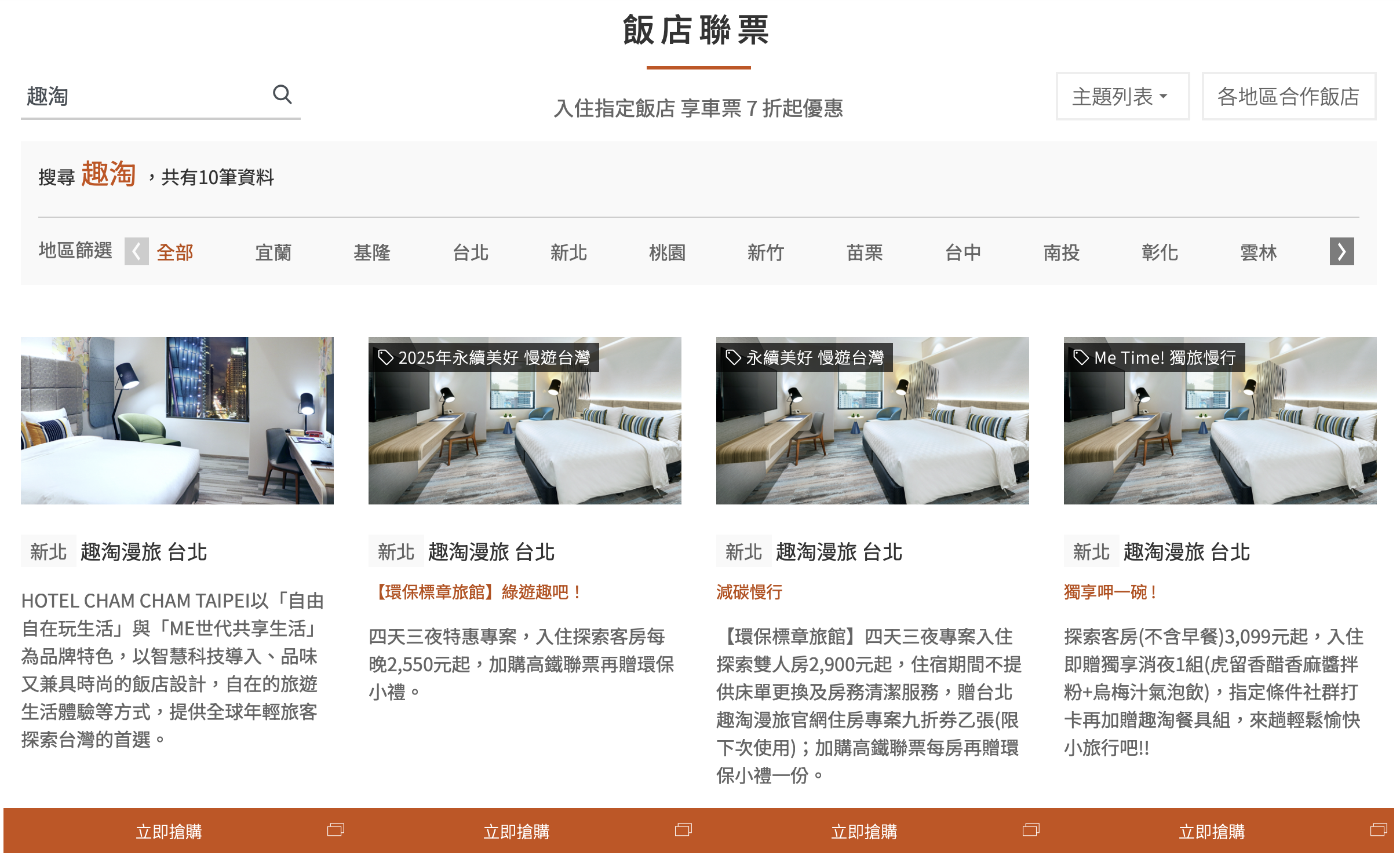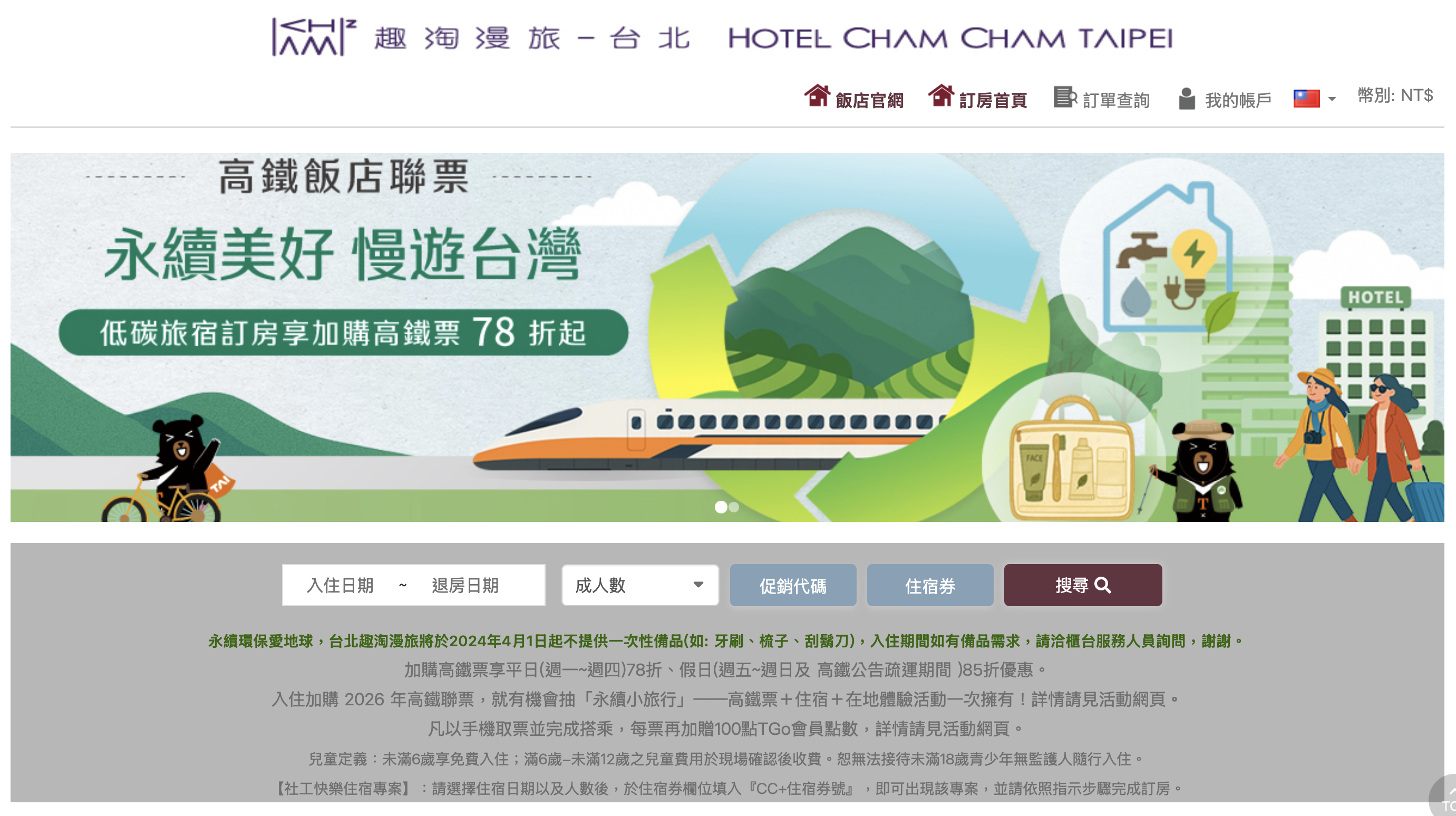 | 趣淘漫旅台北 (HOTEL CHAM CHAM – Taipei) |地址:新北市板橋區中山路一段139號 |電話:02-8951-6686 |入住時間下午3點,退房時間中午11點 |飯店備有停車場、特約停車場 |高鐵飯店聯票方案| ✨Crispy 聖誕趣 住房專案 每晚NT$3,899起 專案內容: |贈送早餐 |贈送BAR98歡樂食光餐點兌換券 |預訂此專案即可抽聖誕樹香氛蠟燭(共5組) ✨高鐵飯店聯票 訂房加購11/1-12/31期間搭乘高鐵票 享平日(週一至四)7折、假日(週五至日)8折優惠 雙人左營-板橋來回最高省1,760元起! 其餘期間仍享有平日78折、假日及疏運期間85折優惠 |