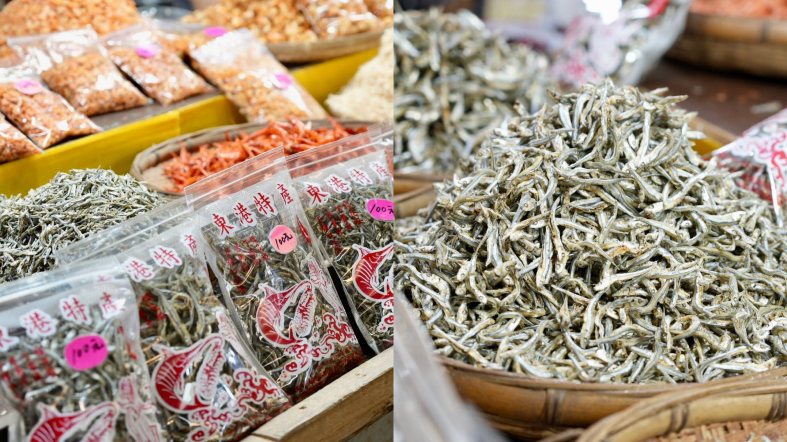 魚市裡面還有許多乾貨,小漁乾、魚鬆都是不錯的伴手禮,還有這家「旗魚黑輪」一定要吃,一支12元的先做黑輪,裡面還可以吃到蛋黃,是排隊名店喔!