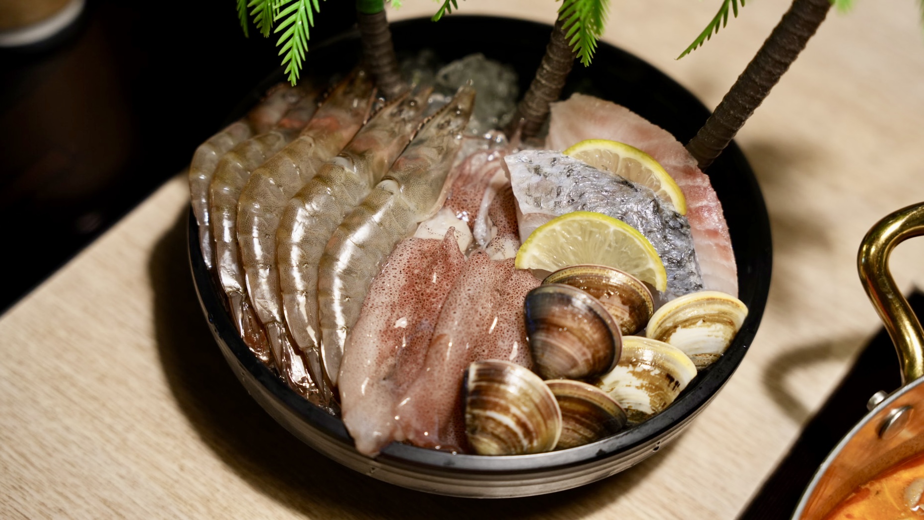 雙人套餐中的肉品也可以選擇海鮮拼盤,五福海鮮拼盤包含白蝦、小卷、蛤蜊、鱸魚片、鯛魚片,泰式冬陰功湯裡面一定要有海鮮才對味,涮煮蛤蜊、白蝦,酸辣甜口味非常搭!