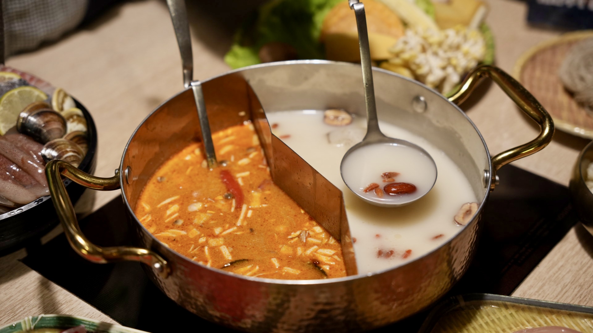 泰暖冬陰功湯是將泰國最具代表性的湯品做成火鍋,融合了檸檬的酸、辣椒的辣、魚露的鮮甜,再加入椰奶增加濃郁口感,整體酸辣夠味,涮肉、煮海鮮都很好吃,風味強烈非常下飯!