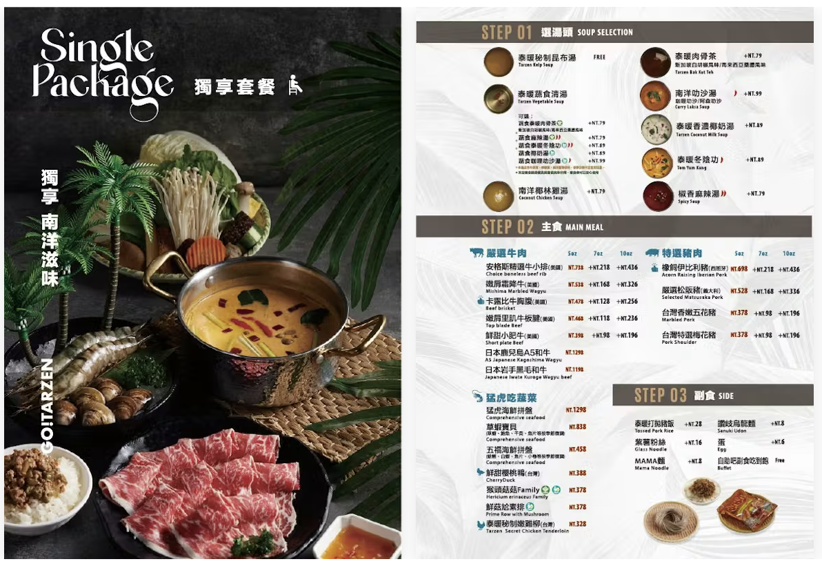 鍋泰暖主打泰式南陽火鍋,特別推薦兩款湯底:泰暖冬陰功湯、泰暖肉骨茶湯,一個重口味、一個溫順暖胃,適合鴛鴦鍋的組合。