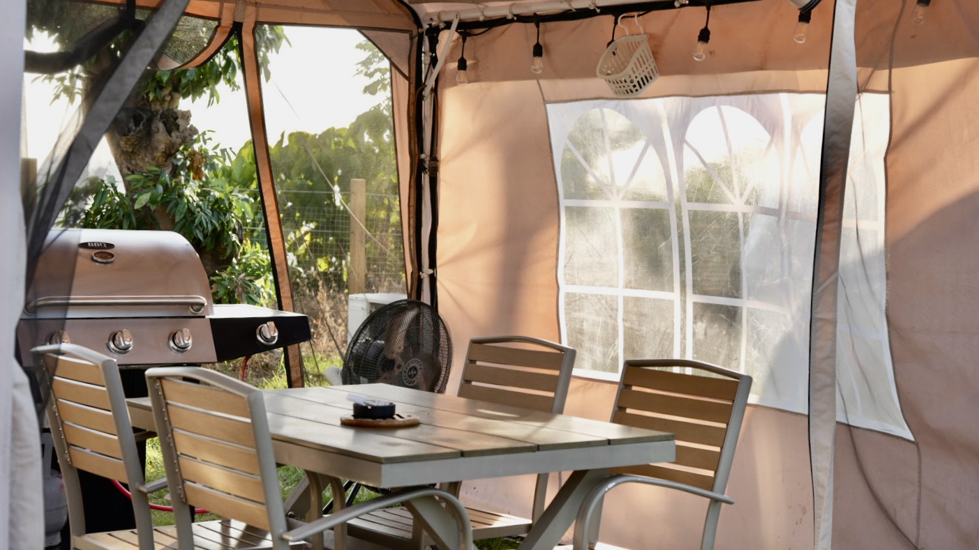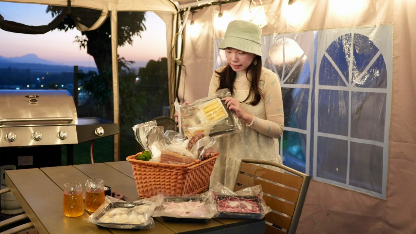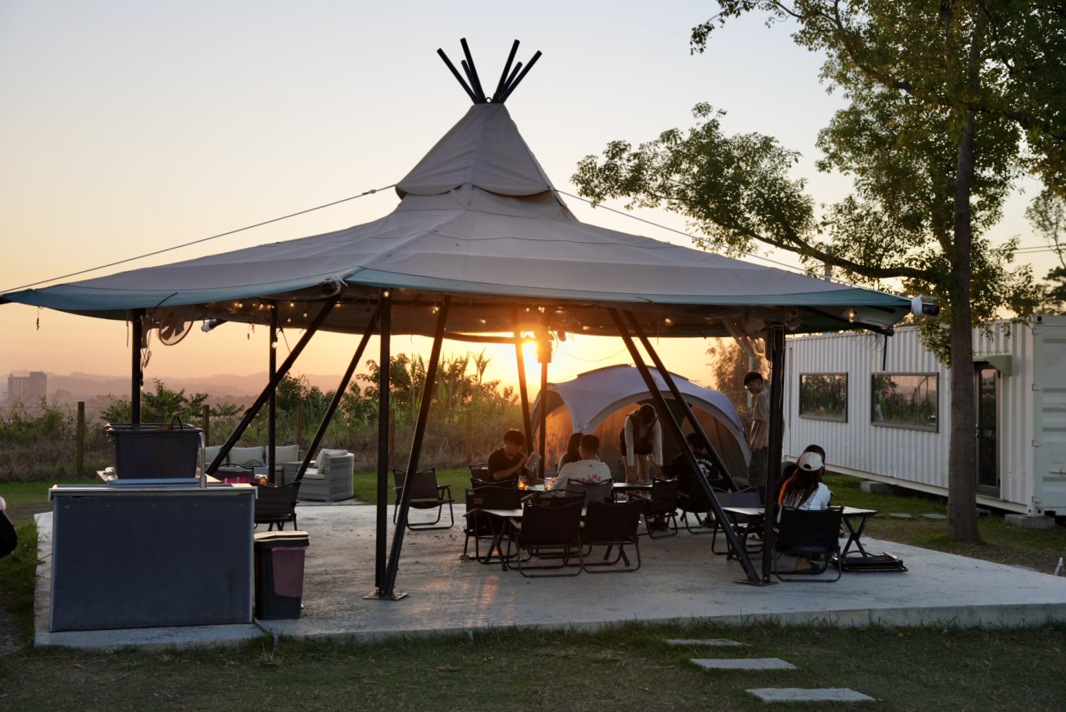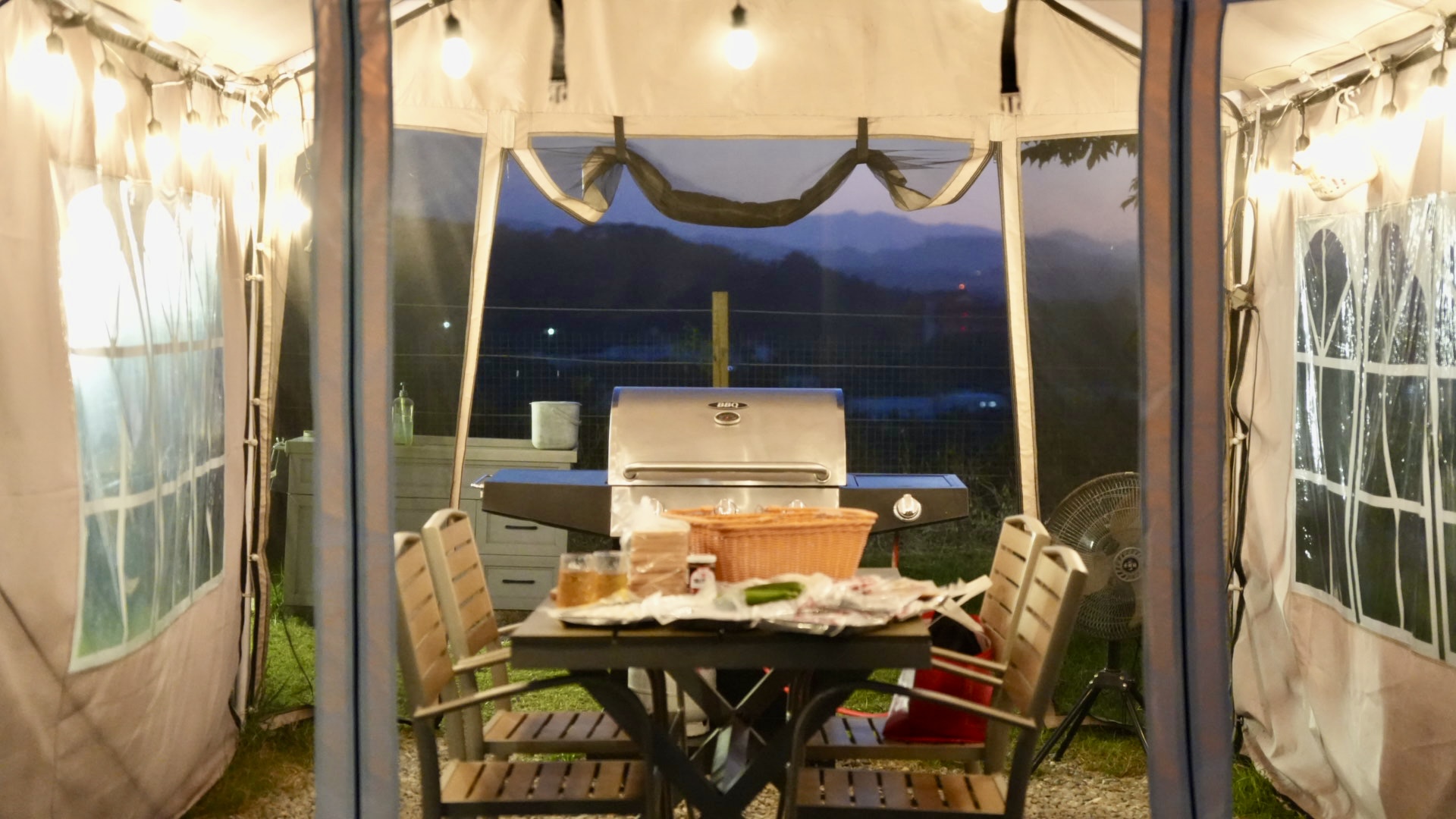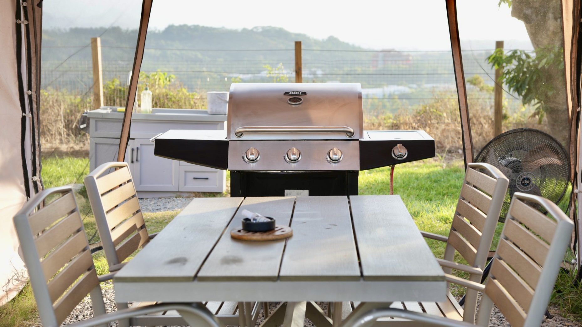 每個帳篷外都設有專屬私人休憩區和燒烤區,提供獨立的用餐空間和美式燒烤爐,晚餐可以加購火鍋或燒烤,也可以自備食材來烤肉唷~