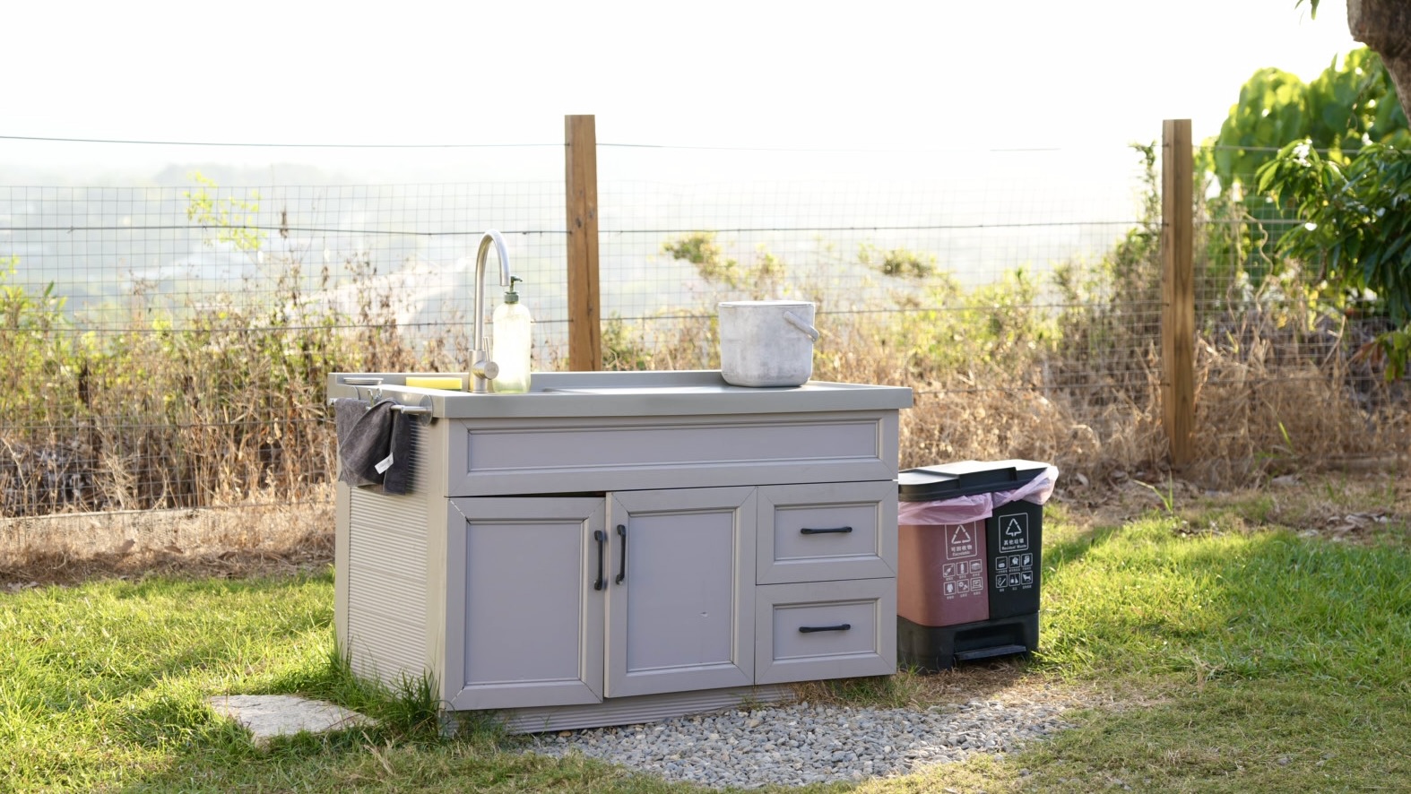 覺得每個帳篷外有洗手台很讚,櫥櫃裡面有提供各式鍋碗瓢盆,煮火鍋、燒烤的道具這邊都有,不用自備鍋子、碗盤,只要帶食材來就能烤肉囉~當然也可以像我們一樣直接跟營區訂購,超方便唷!