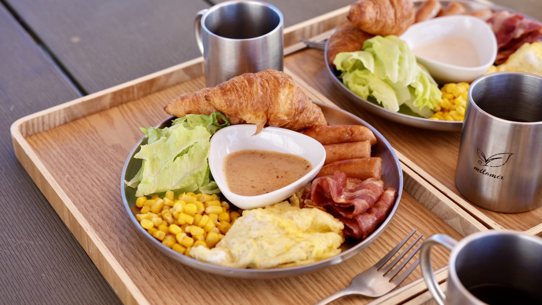 入住時會登記隔天早餐時間,8點~10點供應早餐,一樣前往營本部領取早餐,早餐是豐盛的西式早餐,可頌麵包、沙拉、德式香腸、培根、炒蛋。