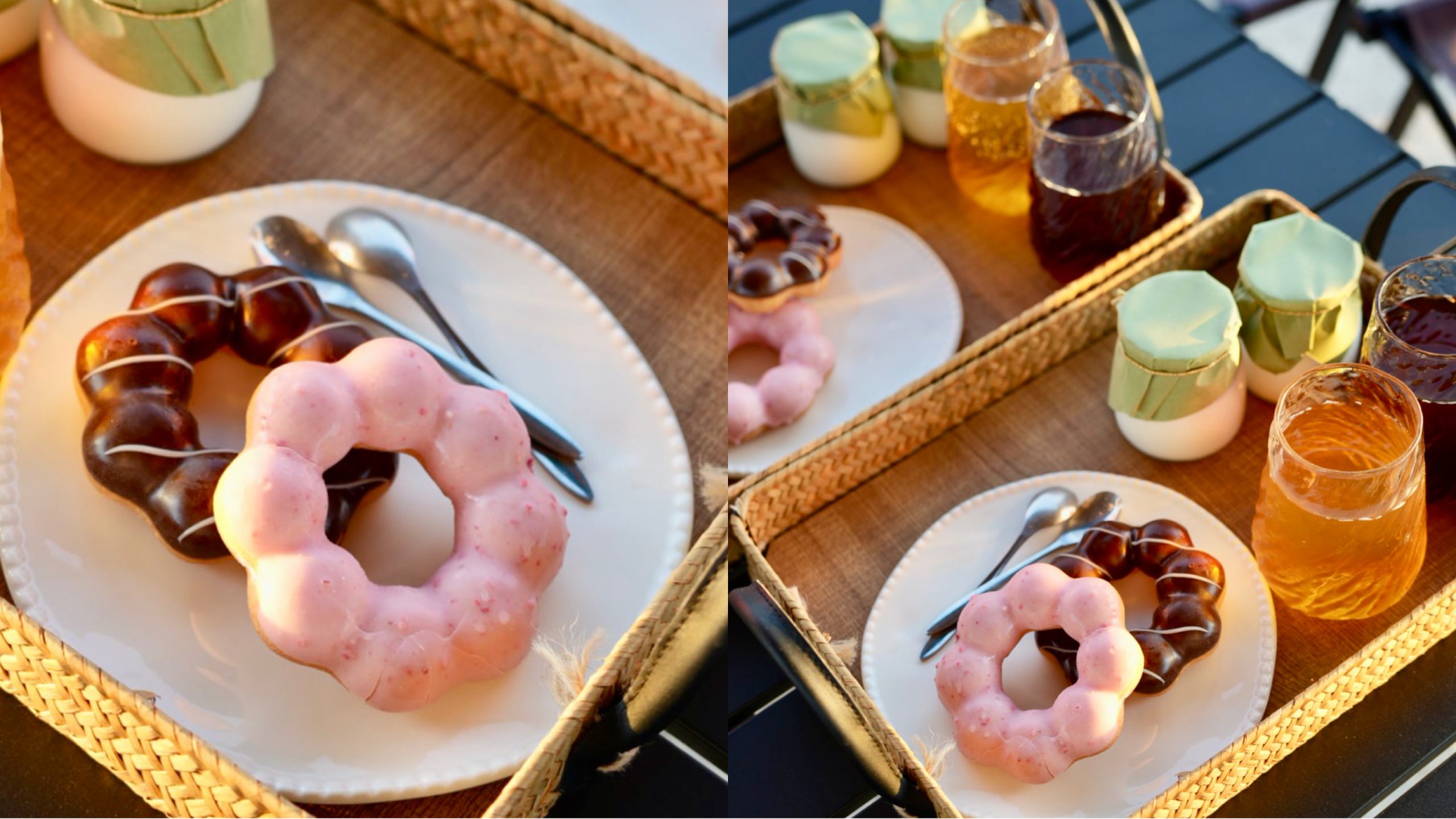 今天的下午茶是甜甜圈+奶酪+飲品,可以端著下午茶回帳篷外的專屬空間用餐,也可以像我們一樣來到大帳篷,一群朋友一起享受下午茶看夕陽。
