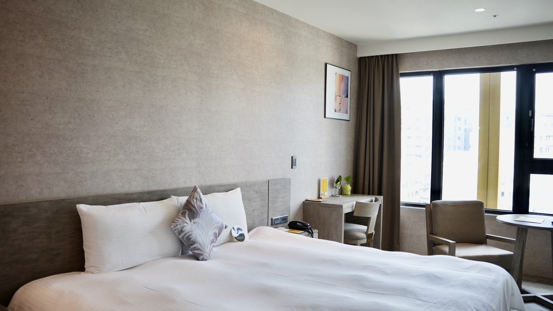 我們今天入住的房型是一大床的「享放鬆客房」,房間約20坪房公尺,除了超大雙人床外,旁邊還有書桌、小圓桌,空間非常寬敞,可以輕鬆打開3個行李箱。房間有大面積玻璃窗,採光很好很明亮。