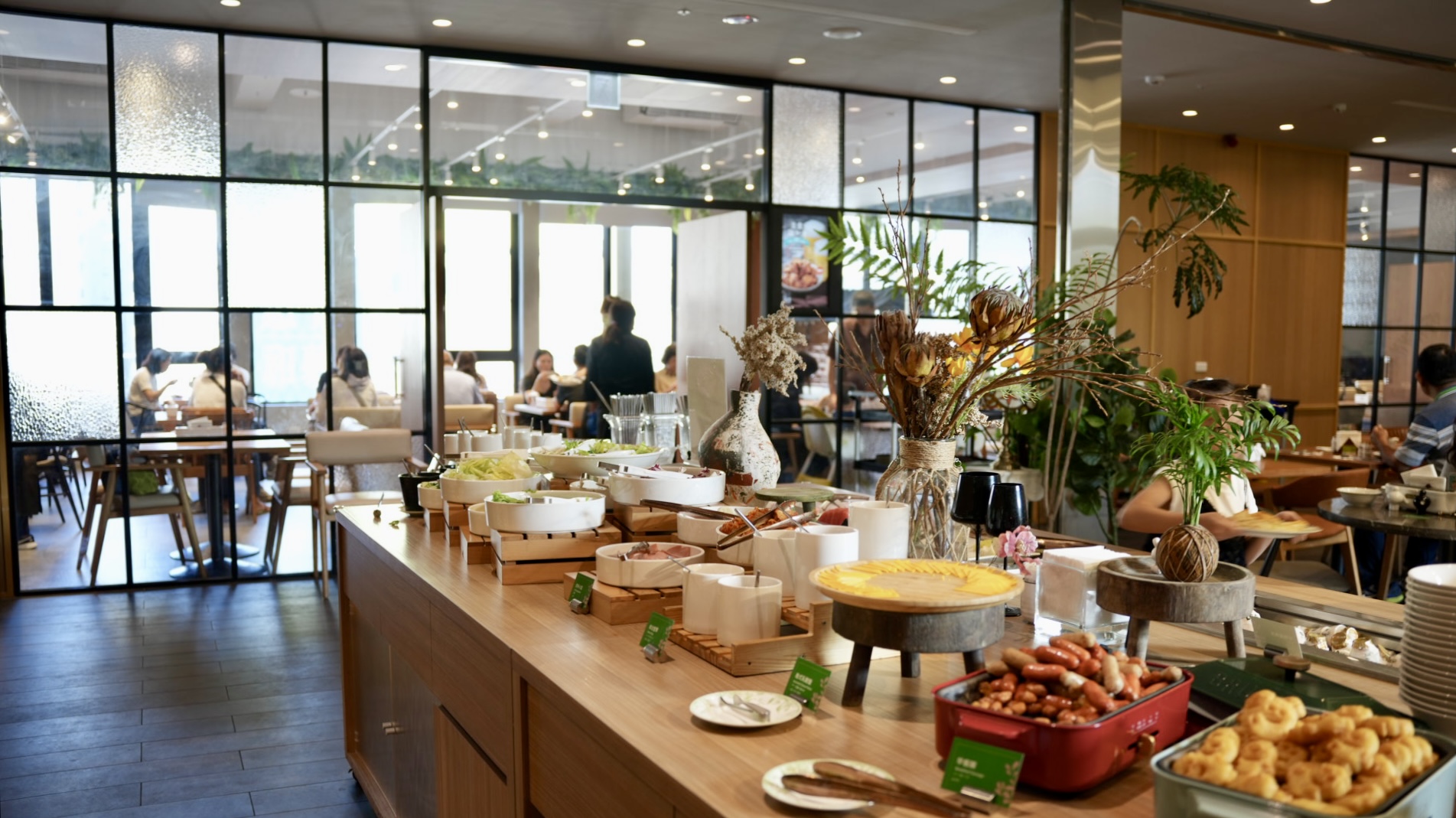 早餐Buffet用餐地點在三樓的沐青餐廳,喜歡這裡木質調搭配綠植的裝潢,用餐座位很多,假日會分時段進場,不過不用擔心沒客滿的話也不會趕人,我們今天從7點吃到10點呢!