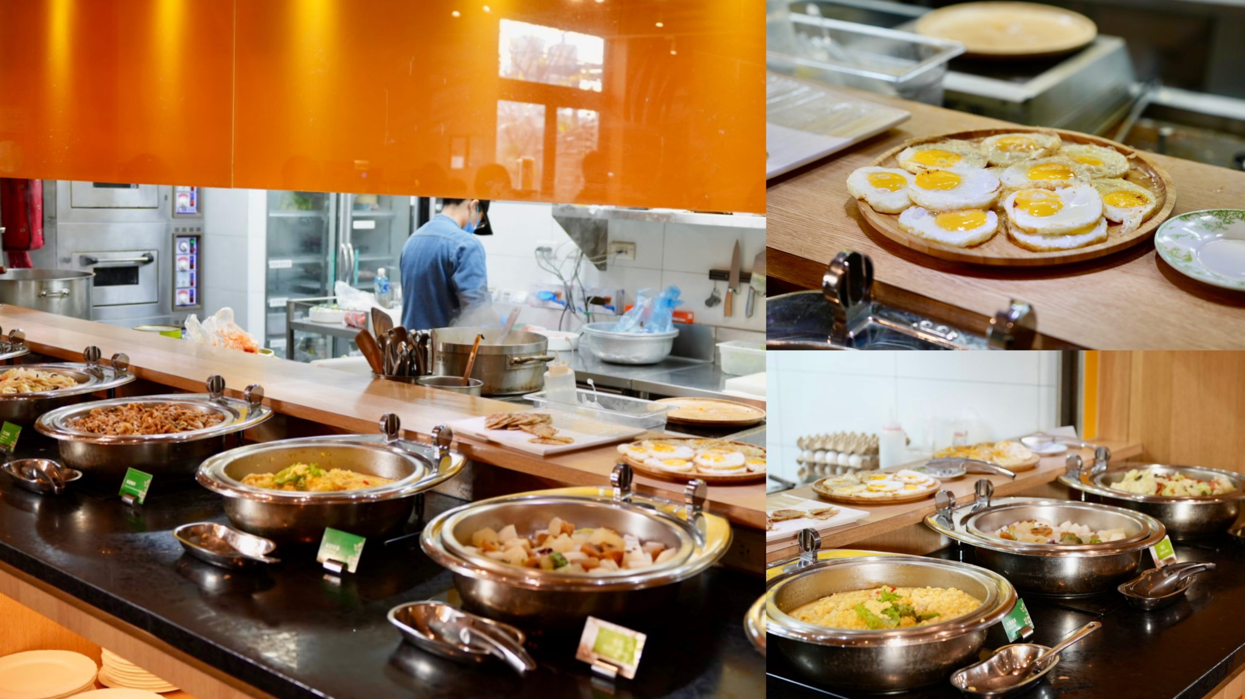 早餐很豐盛,中西式餐點都有,也有提供簡單的素食餐點,中式熱炒、白粥、荷包蛋、蔥油餅、蘿蔔糕通通有,西式有炒蛋、火腿、薯餅、沙拉等等。