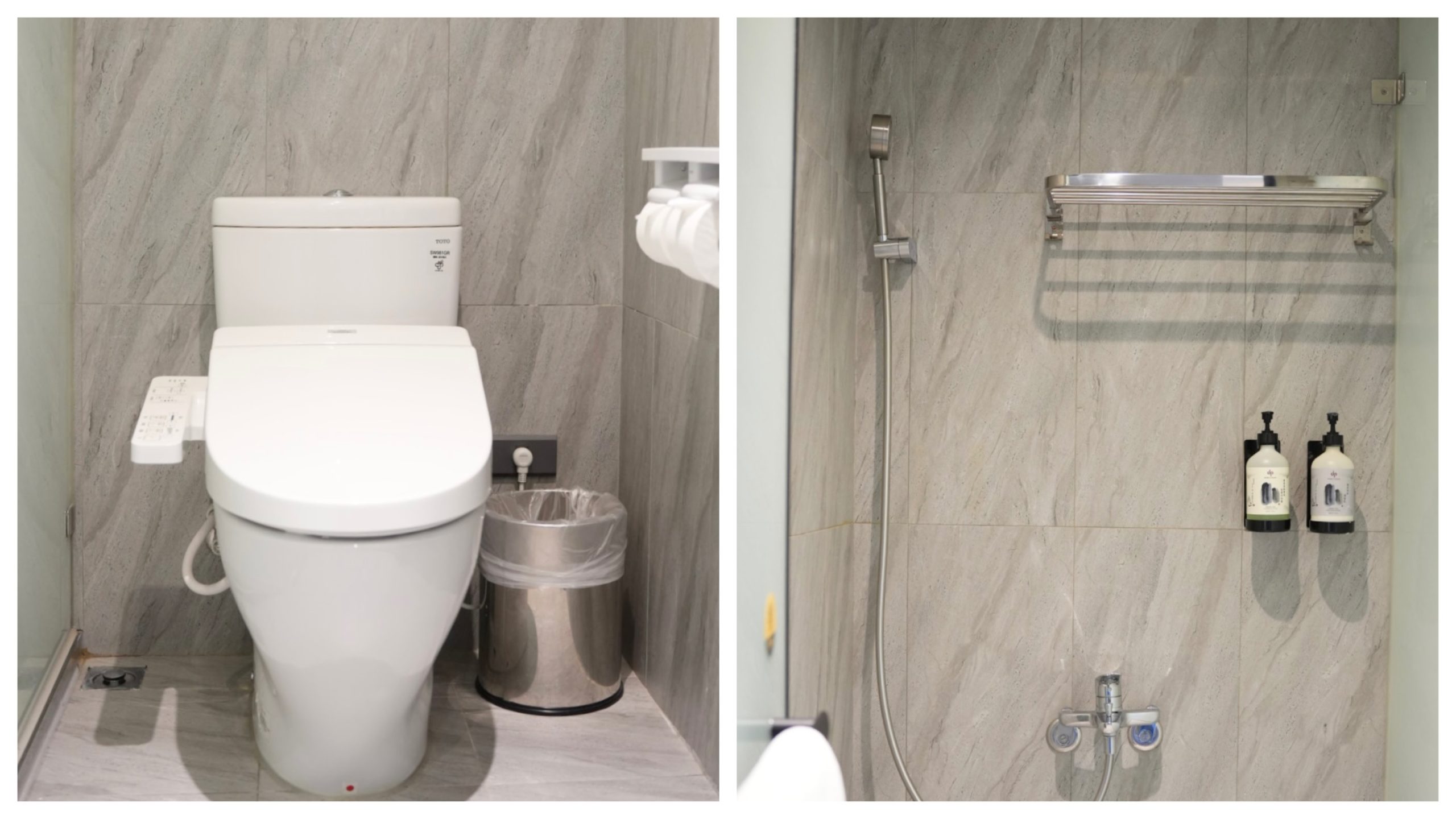 衛浴設備是乾濕分離,馬桶和淋浴空間是分開的兩個空間,比較不會有搶廁所的困擾,設有TOTO免治馬桶,衛浴設備都很新很乾淨。響應環保政策,飯店不提供一次性備品,淋浴間有提供洗髮沐浴乳二合一和潤髮乳。