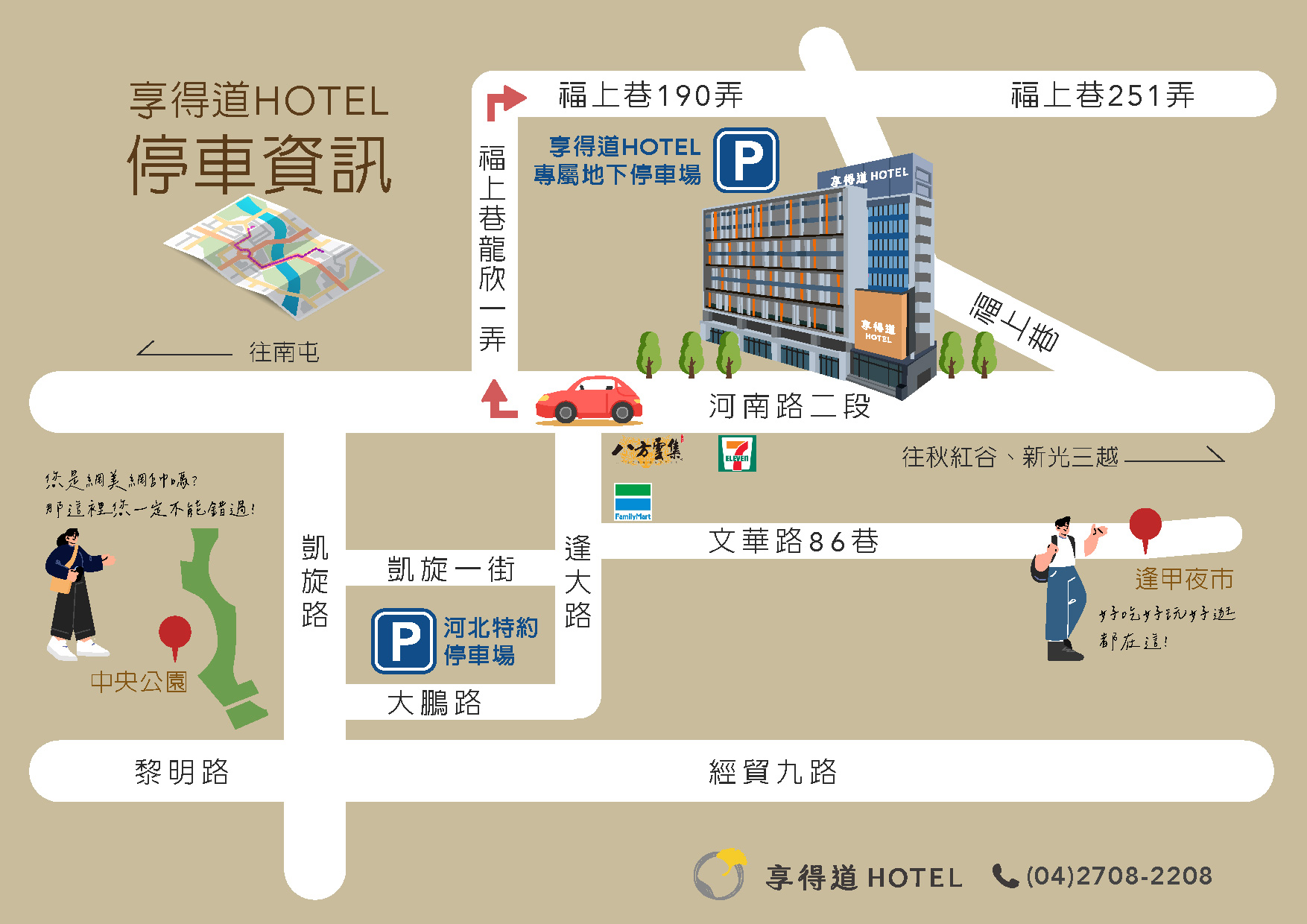 台中享得道行旅 |地址:台中市西屯區河南路2段211號 |電話:04-27080189 |入住時間下午3點,退房時間中午11點 |飯店備有停車場、特約停車場 |全館禁煙、禁止寵物入住 |高鐵飯店聯票訂房| |Agoda訂房|AsiaYo訂房| |