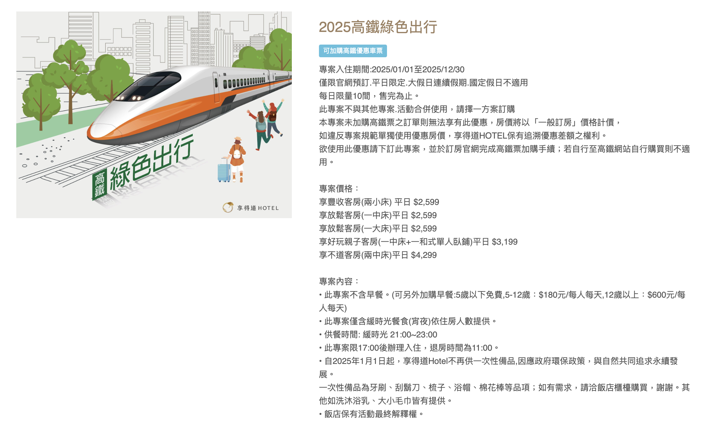台灣旅遊真的很方便,北中南都可以搭高鐵前往,而且許多飯店都可以訂到「高鐵飯店聯票」,住宿價格有優惠,高鐵票平日在享78折優惠,折上加折真的超划算!
