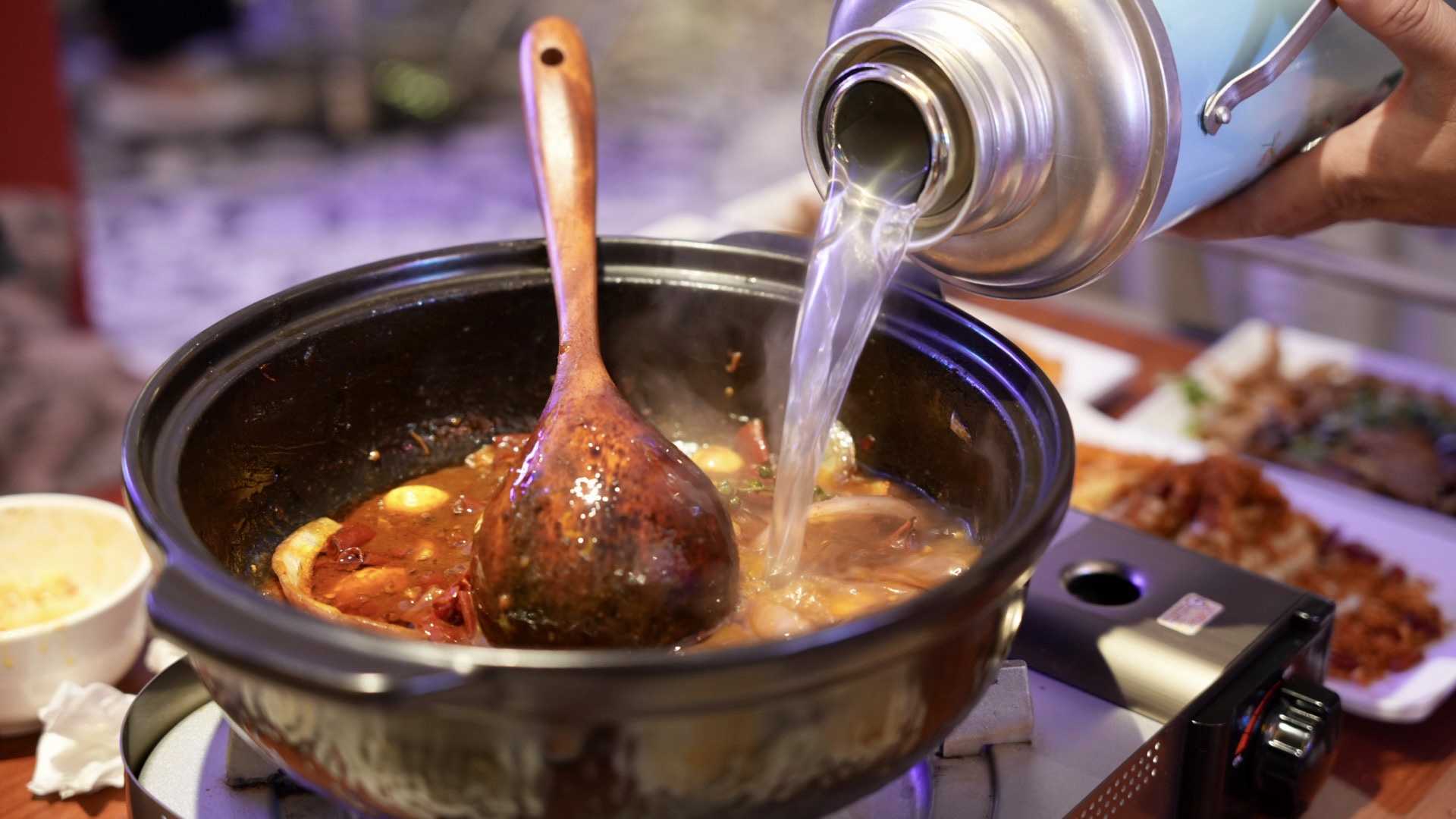 首先先吃乾鍋~也可以將乾炒的雞肉夾出裝盤,請店員加入雞高湯,加湯後的湯頭會越煮越香,湯頭香濃厚實,我覺得口味除了麻辣之外還帶點甜味,是可以喝的好喝麻辣湯底,涮煮牛肉、青菜都很讚!