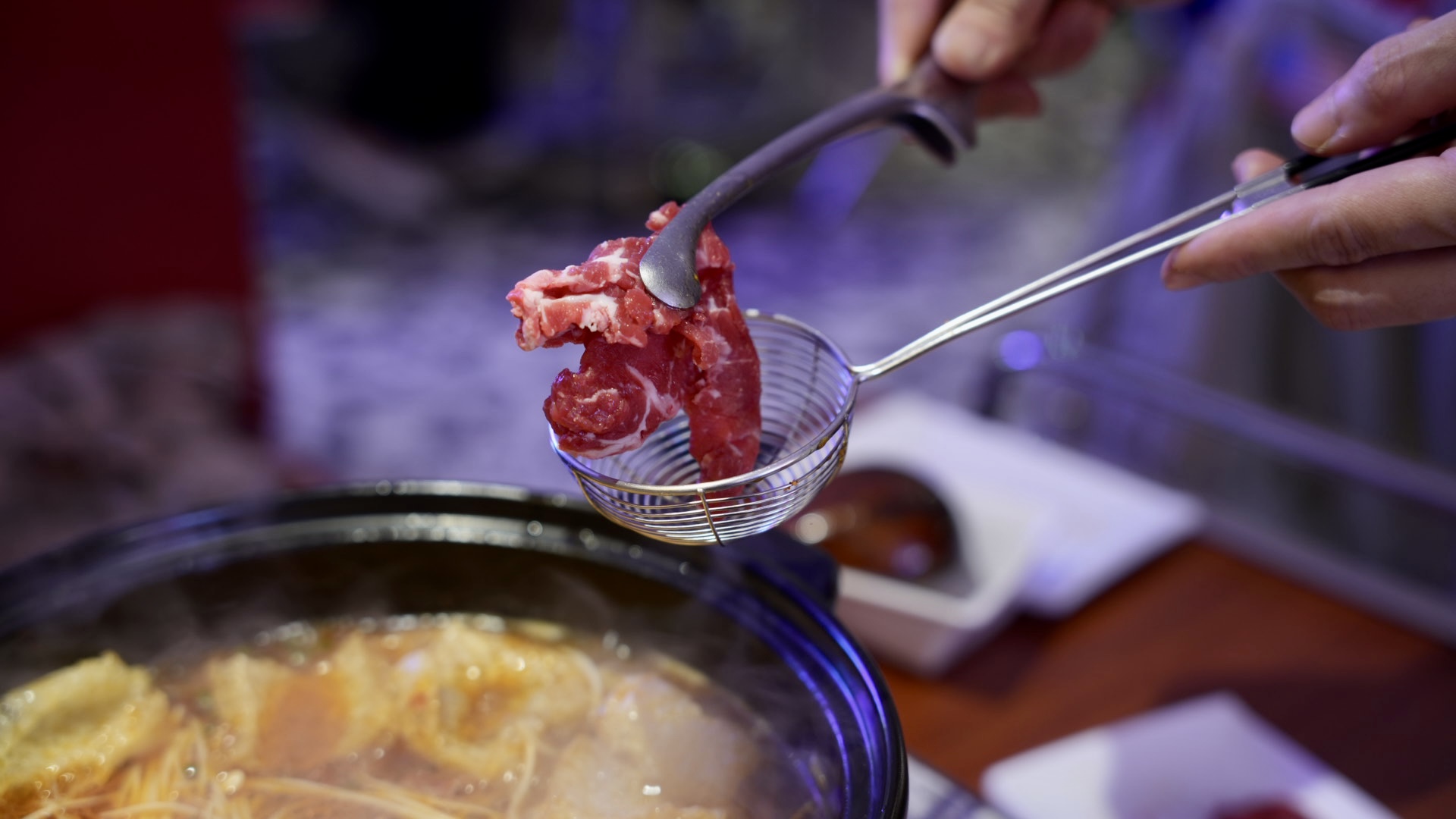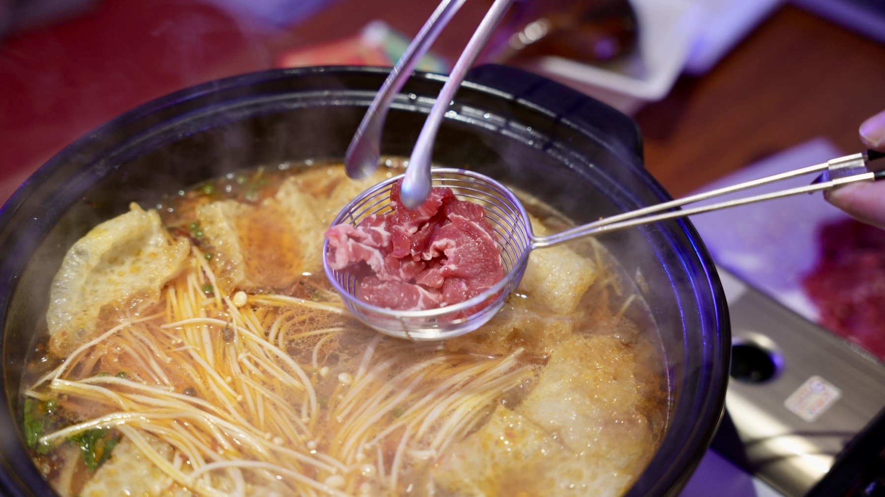 溫體牛肉只要涮個三秒,呈現粉紅色就能享用,入口有濃厚的牛肉香氣,真的非常美味,推薦搭配「乾碟」享用,多了花生的香氣,更有層次而且可以降低辣度唷!
