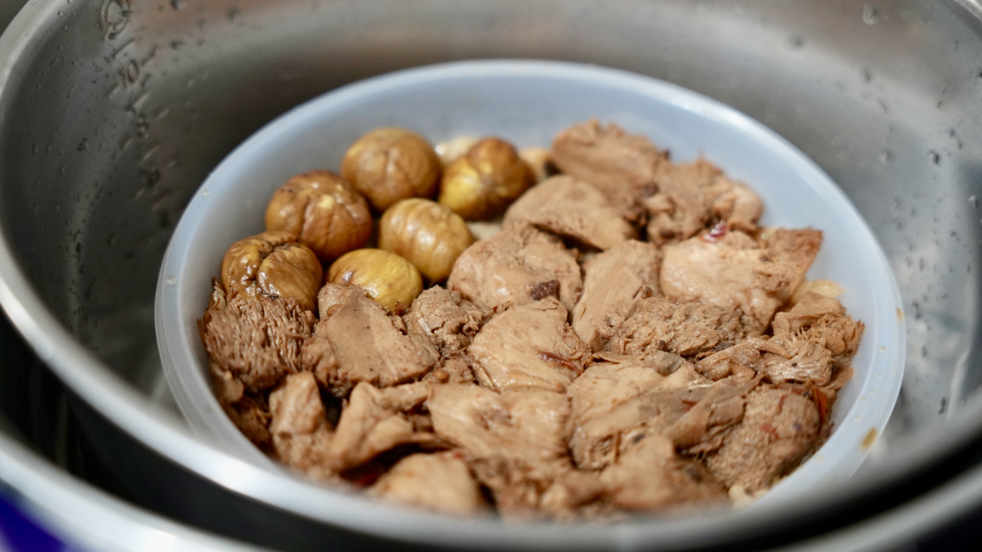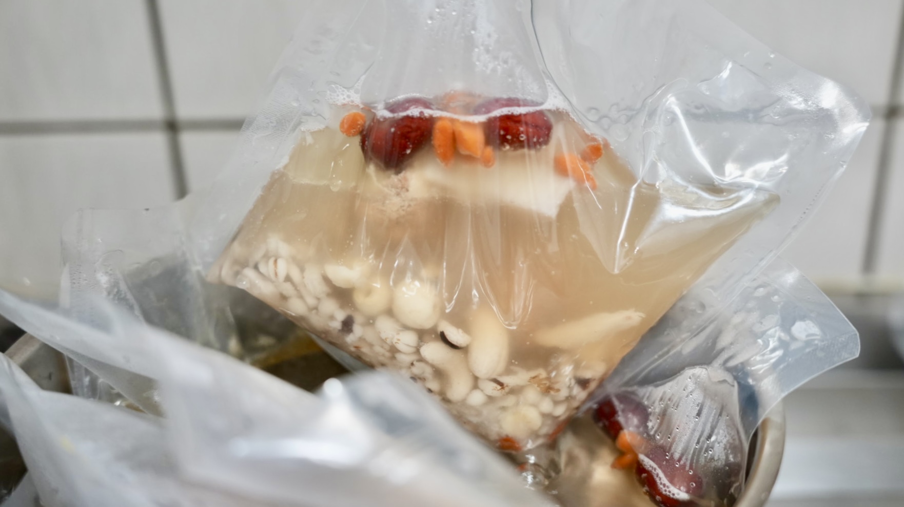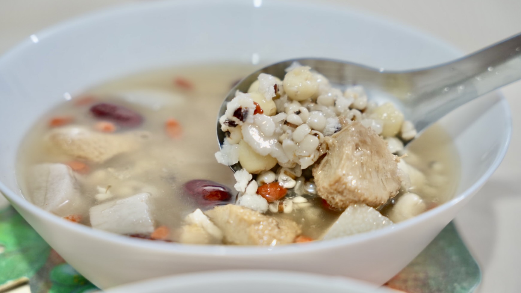 湯品裡面的料真的超級多,有薏仁、蓮子、紅棗、枸杞、猴頭菇、山藥、腰果等等,選用天然的當歸、四神等草藥燉煮,湯頭清澈不油膩,果然慢火熬煮的湯品,才能喝到「時間的味道」。