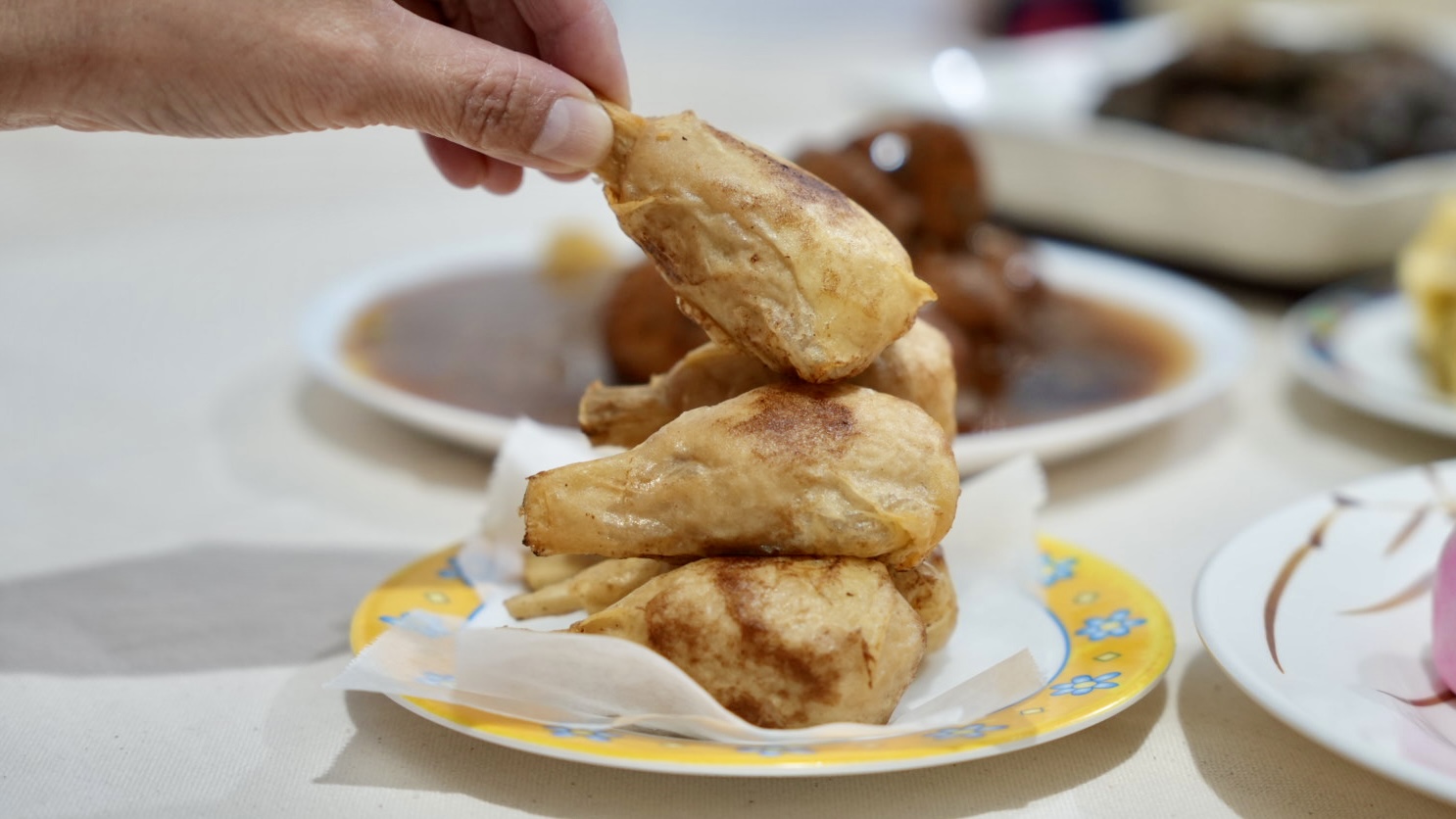 「金酥納福棒棒腿」一上桌就秒殺,可以油炸、氣炸鍋炸、烤箱烤,這是我們家平時就很常買的品相,長得很像小雞腿的素食棒棒腿,是以千張豆皮層層堆捲而成,外皮炸得金黃酥脆,中間吃起來是軟嫩的豆皮口感,味道很香有鹹酥雞炸物的香氣~整隻拿起來啃最過癮!