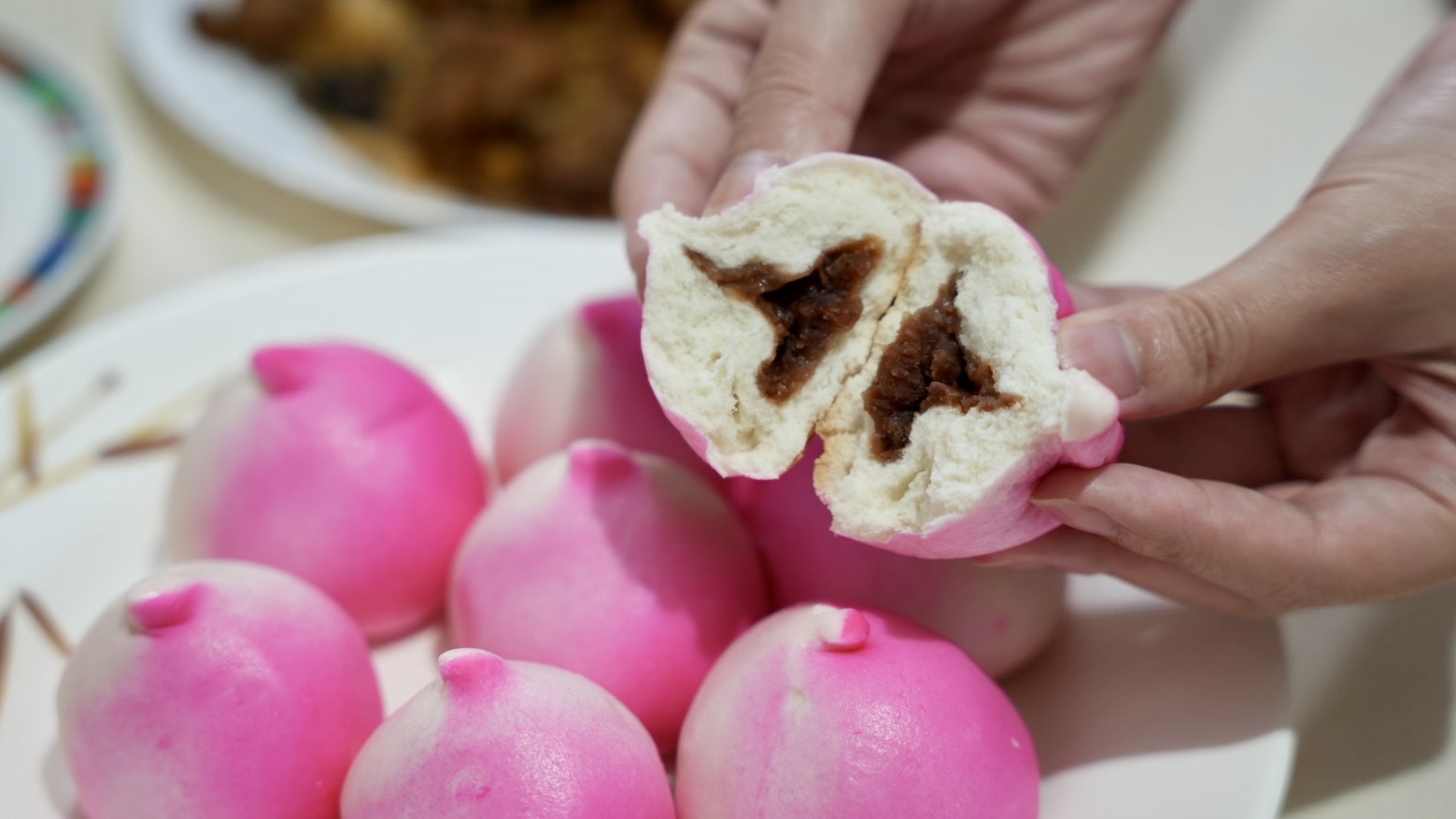壽桃的造型像顆桃子好可愛,麵皮採用老師傅工法,口感鬆軟細緻,內餡豆沙綿密滑順、甜而不膩。