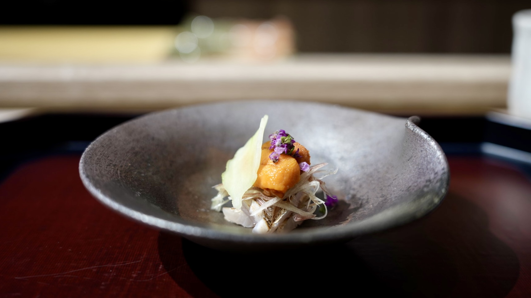 第一道是精緻擺盤的生魚片海膽料理,之前在京都吃過正宗懷石料理,從食材到擺盤到餐具,都是精心設計,主廚會依照當季食材打造無菜單料理。