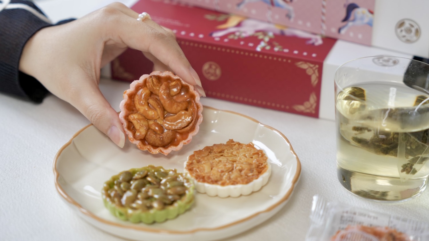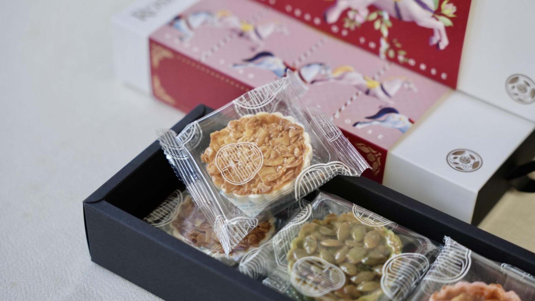 今年禮盒中的茶點,是選擇「犁品茶記見花餅」,包含三種口味共6顆的見花餅:焦糖杏仁、蜜汁腰果、酥香南瓜子,造型猶如盛開的花朵,寓意花開富貴。