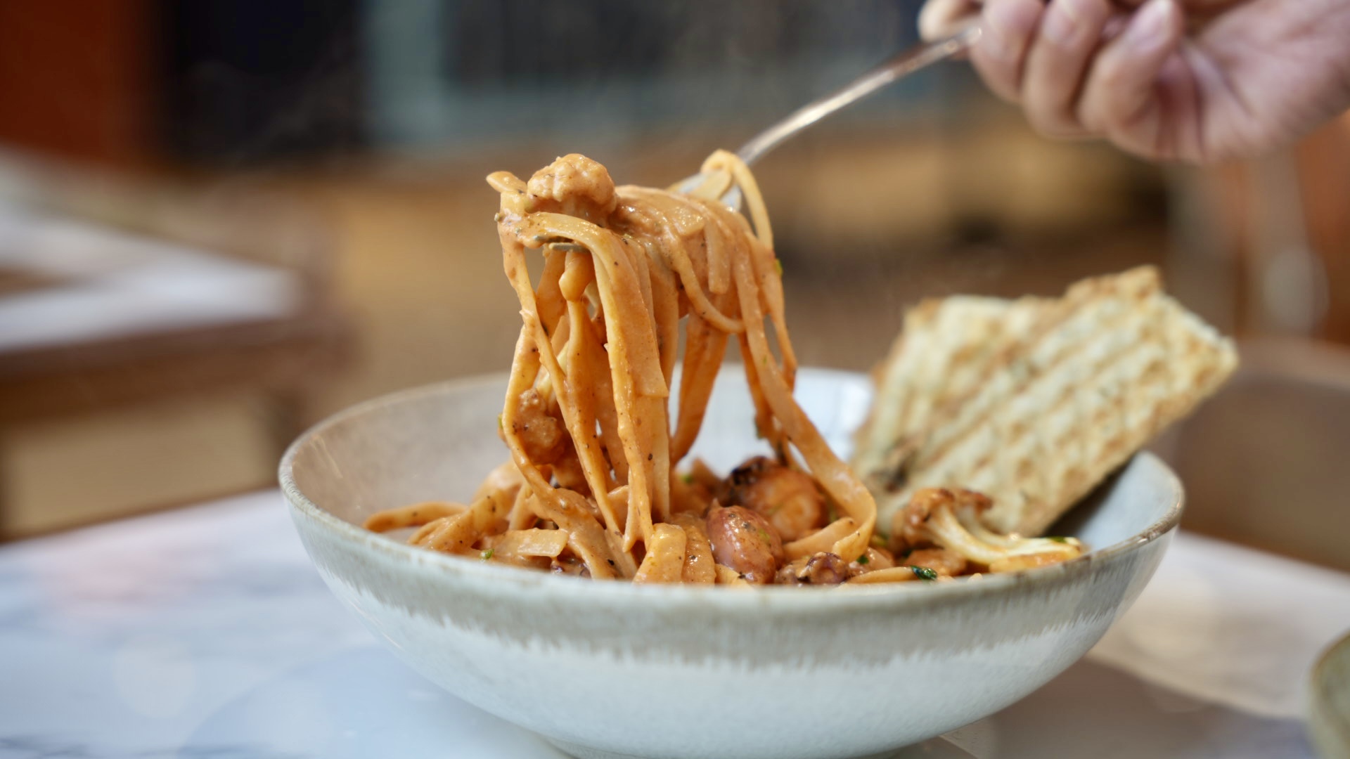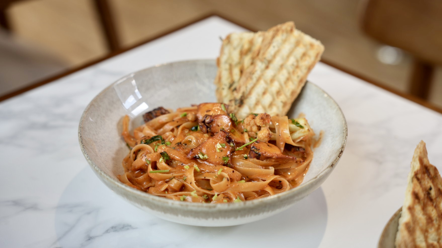 林口店限定!我選擇的口味是伏特加奶油蕃茄紅醬,義大利麵條是寬麵,吃起來有點嚼勁的麵條,裹滿醬汁入口好幸福,粉紅醬吃起來酸酸的但很濃郁,真的很好吃!火烤章魚很Q彈有嚼勁,火烤有香氣很讚呢!