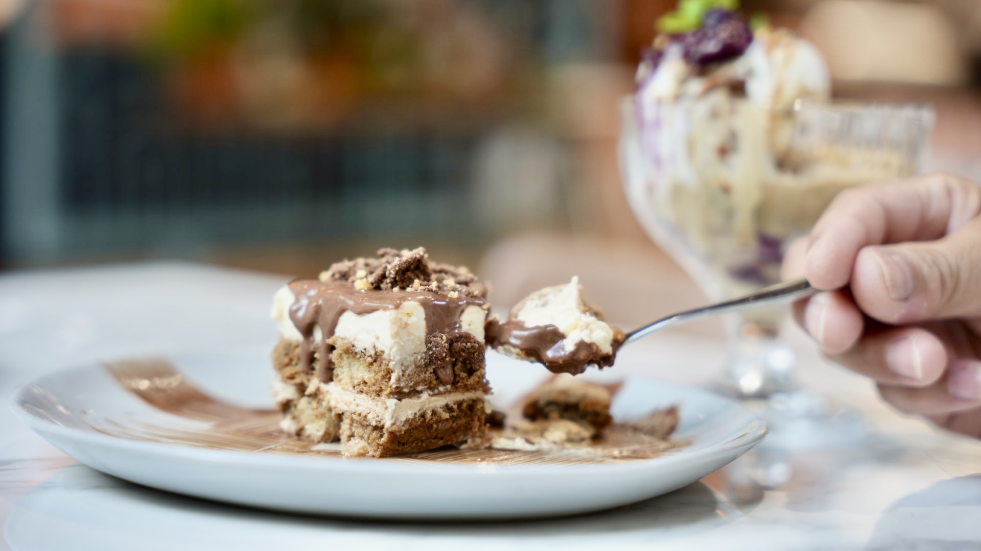 甜點推薦超好吃的「酒香提拉米蘇」,提拉米蘇軟綿口感,入口濃郁的酒香和濃縮咖啡香氣,這是專屬大人味的甜點,上面再淋上自製的巧克力醬,是完美的甜點Ending!