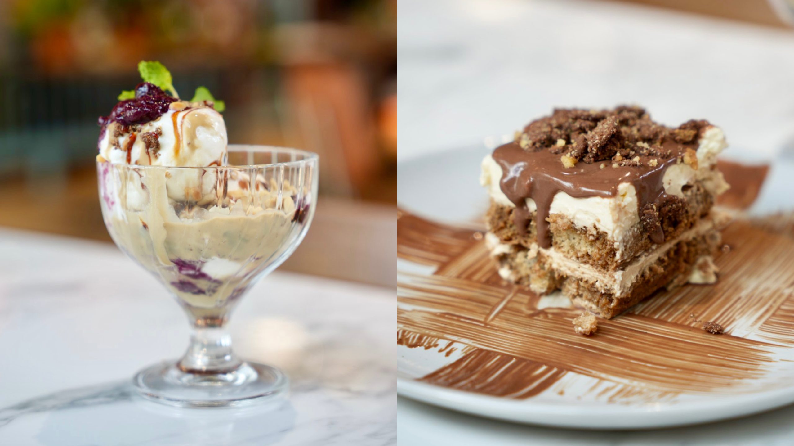 左邊這杯是地中海聖代,香草冰淇淋搭配酒燒野莓果醬,撒上香烤松子杏仁,淋上純天然白芝麻醬和有機棗蜜。