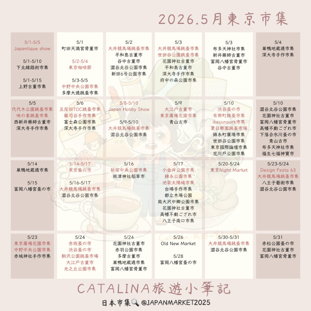 日本有超多市集,幫大家整理好「東京必逛市集12選」,來到東京玩絕對不能錯過挖寶的機會,東京有各式各樣的古董市集、跳蚤市集、手作市集,東京最大二手市集「大井競馬場市集」,古董迷最愛的「大江戶古董市」,手作人推薦「雑司谷手創市、赤坂蚤の市」,每年只有5月、11月舉辦的最盛大的「東京蚤の市」,出發東京前記得先收藏每個月的東京市集行事曆,跟著Catalina的腳步輕鬆逛東京市集吧!