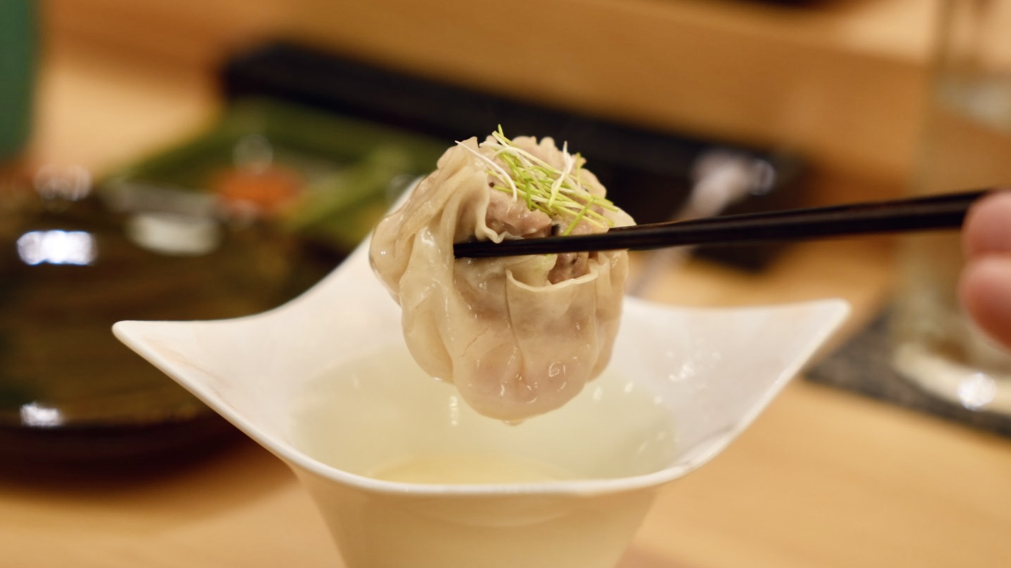 首先上桌的是店家自製的「雞肉燒賣」,有別於傳統的燒賣,這顆燒賣很大一顆,中間包著肌肉及雞軟骨,香氣十足又多了雞軟骨脆口的口感,很有層次。