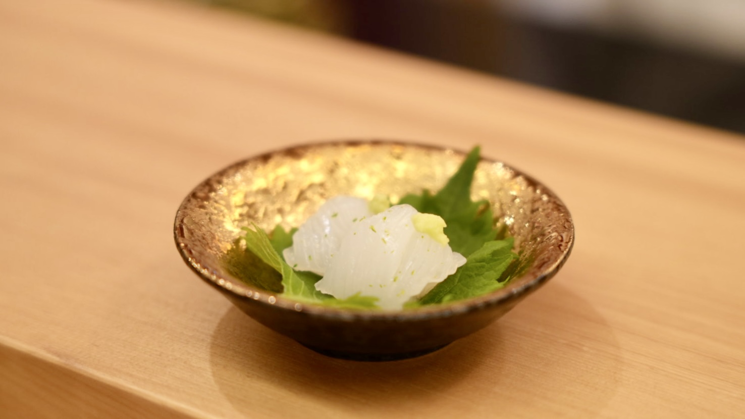 接著是一連串的生食海鮮,這一道是「槍烏賊」吃起來滑嫩又Q軟,吃起來很鮮甜,上面以德島酸橘點綴,增加清新的酸度,可與紫蘇葉一起享用,味覺上會帶來較強烈的衝擊。