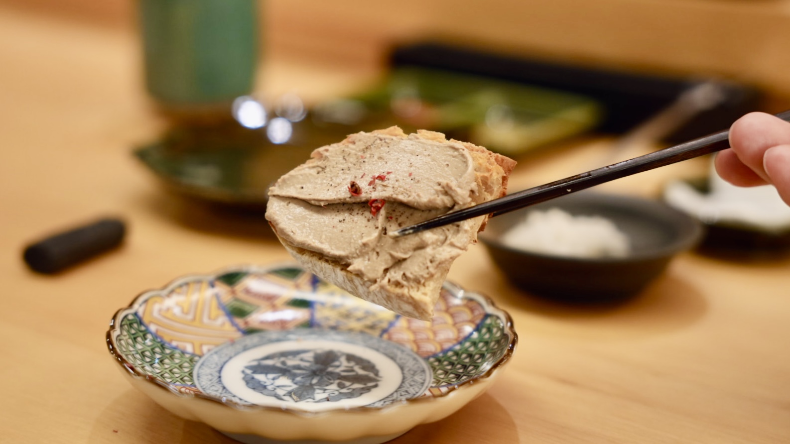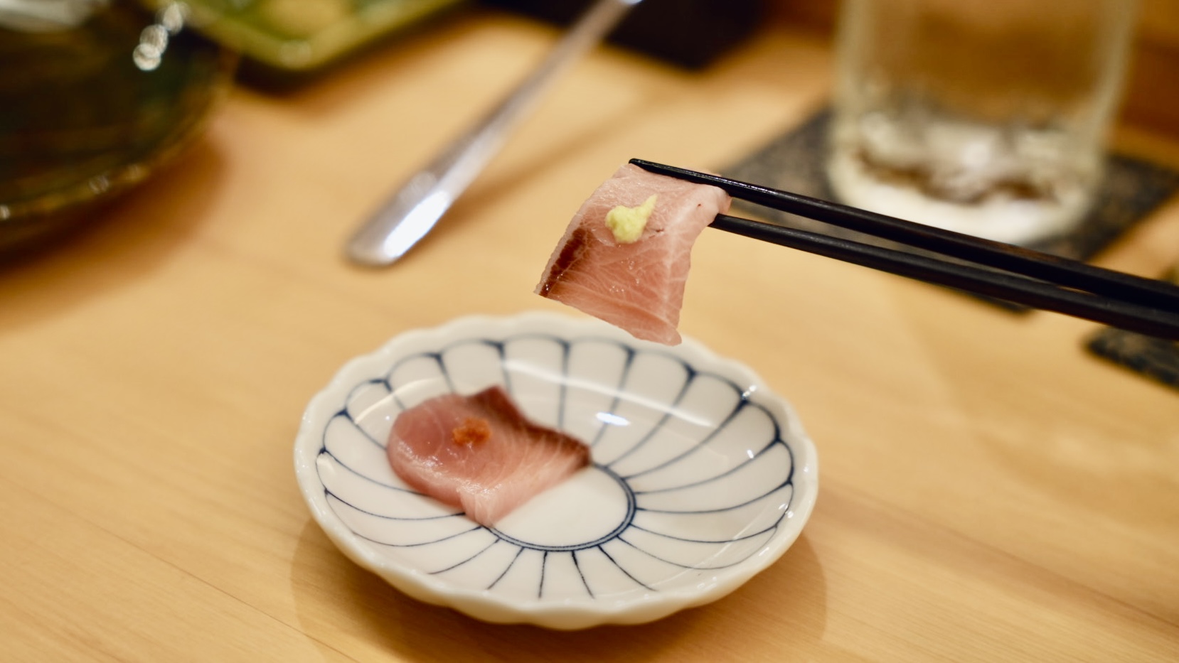 來自日本的能登半島的「鰤魚」刺身,冬季的鰤魚油質豐富,吃起來魚肉細緻很新鮮,兩塊分別搭配不同佐料,一塊吃基本的山葵與鰤魚的風味,另一塊搭配熟成辣椒醬,完全是不同層次的口味,非常喜歡呢!