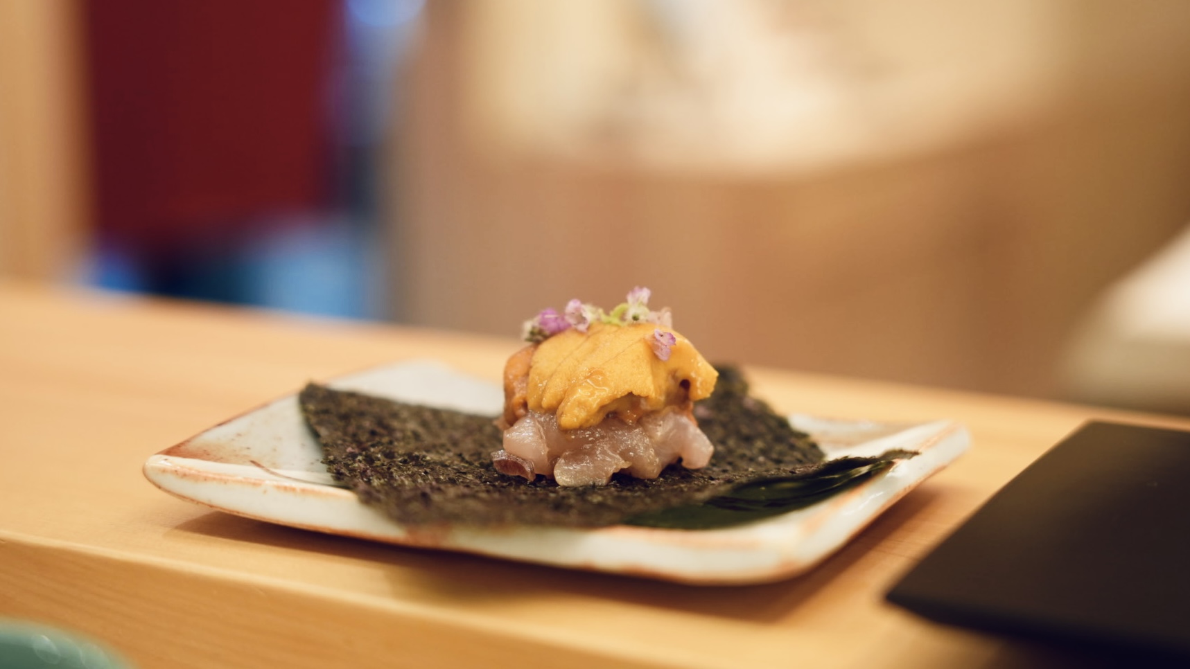 看到料理長端出美麗的海膽,就讓人非常期待,選用日本北海道的馬糞海膽,搭配竹地雞「生雞胸肉」,經過昆布漬處理過,一口下去吃起來像生魚片軟滑的口感,馬糞海膽很Creamy很鮮甜!第一次挑戰生雞肉,原來這麼像生魚片,非常美味唷!