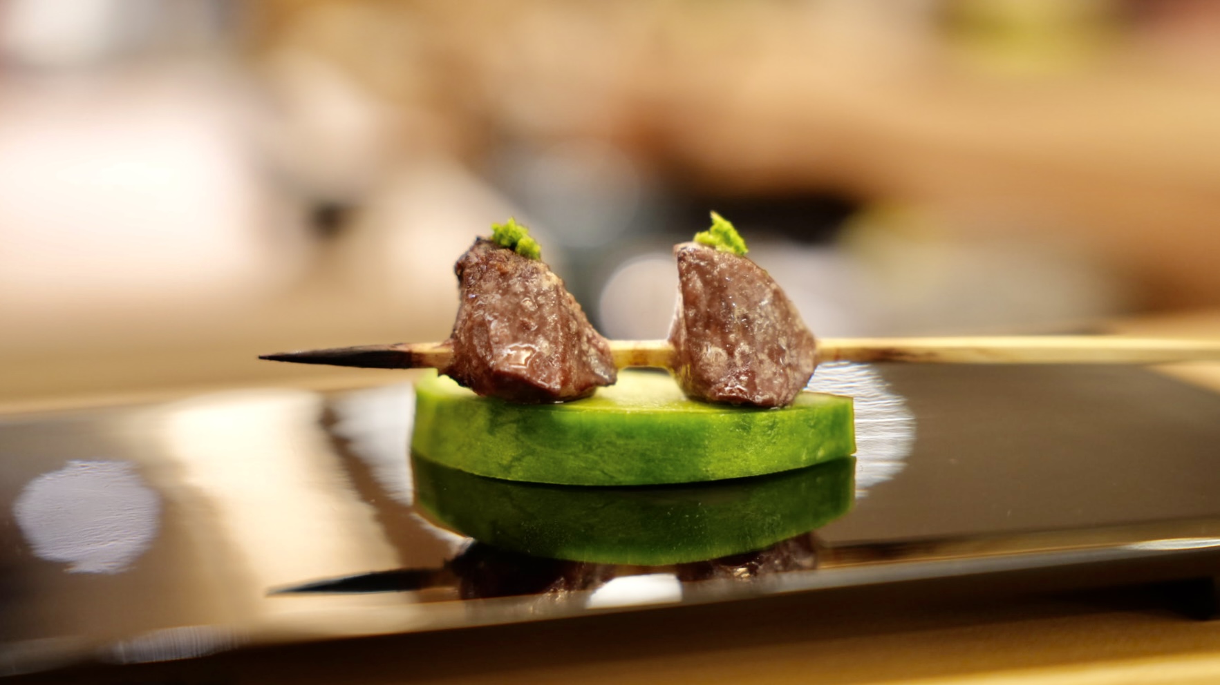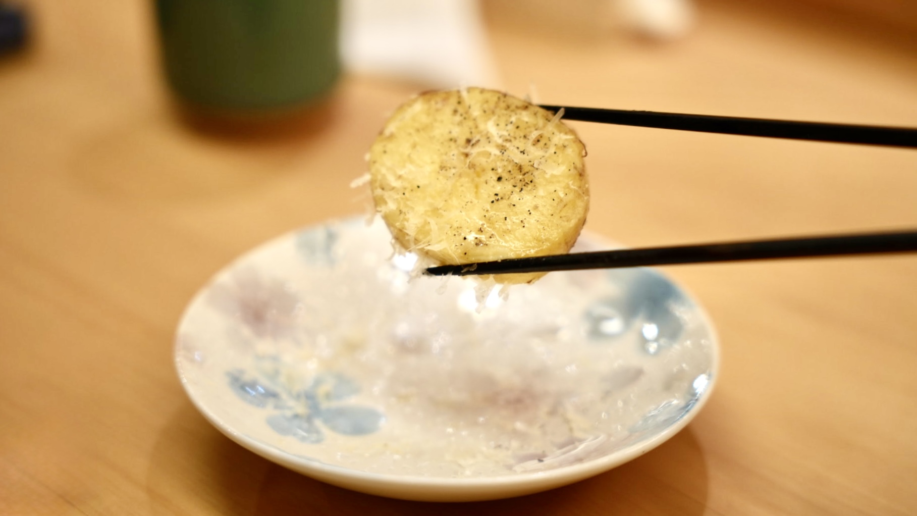 主廚介紹這是「雞肩膀」,好可愛的名字,其實就是雞翅部位的其中一塊,一口大小入口,先吃到雞皮超級酥脆,咬下去會爆汁,雞肉好軟嫩好多汁,簡單的調味搭配蒜苗一口吃,香氣十足。