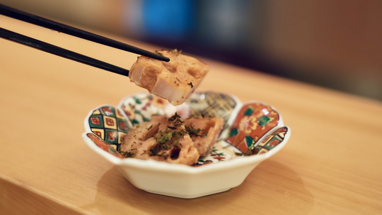 燒鳥吃一吃上桌了一份「炸蓮藕」轉換風味,好酥脆但不油膩,搭配海苔碎整體很香。