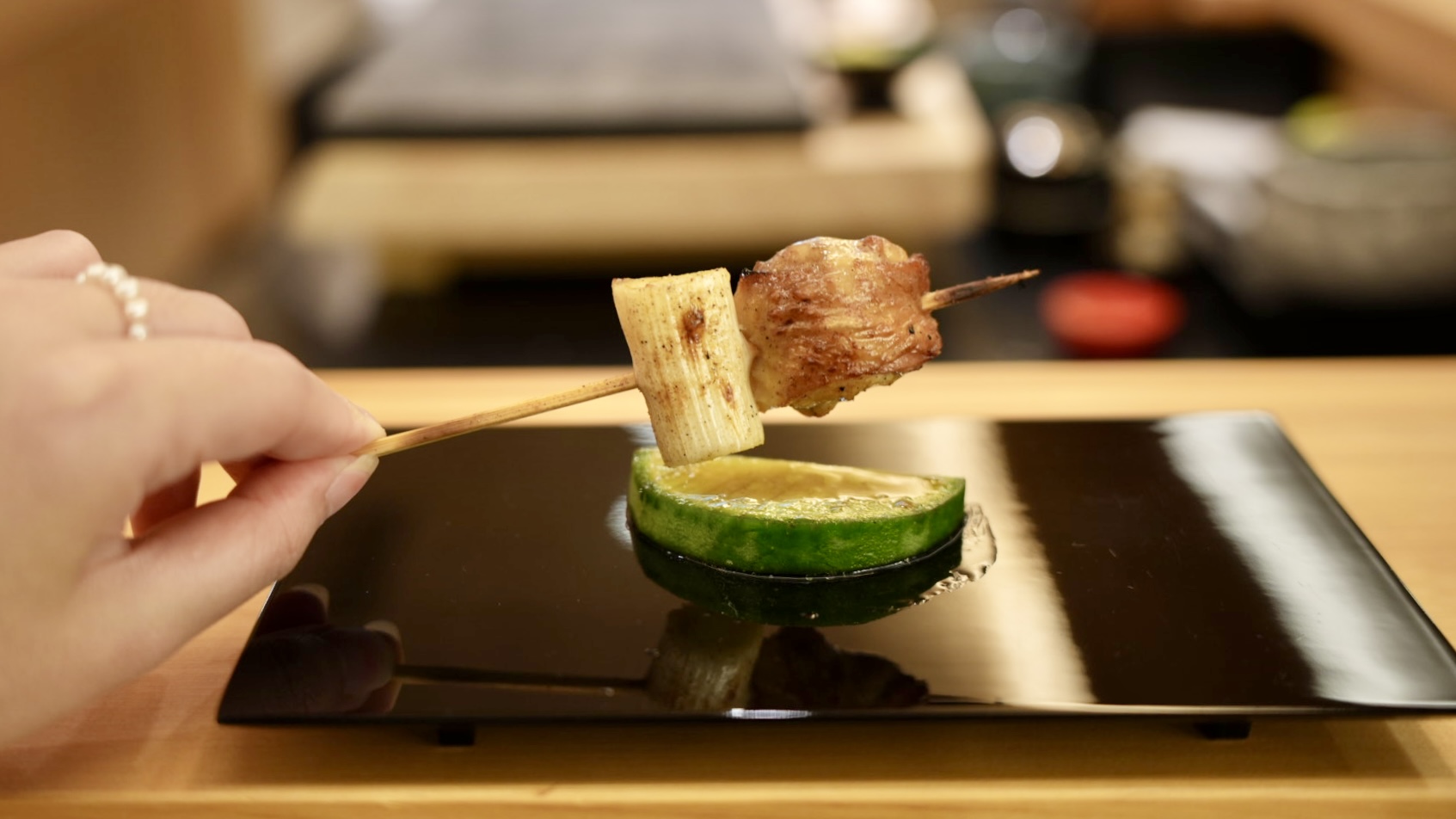 套餐中的最後一串燒鳥,是珍貴的稀有部位「雞生蠔」,每隻雞只有兩小塊,為在雞腿根部的部位,口感非常軟嫩多汁,一樣外皮焦脆中間很Juicy,配上風味飽滿的日本白神蔥剛剛好。