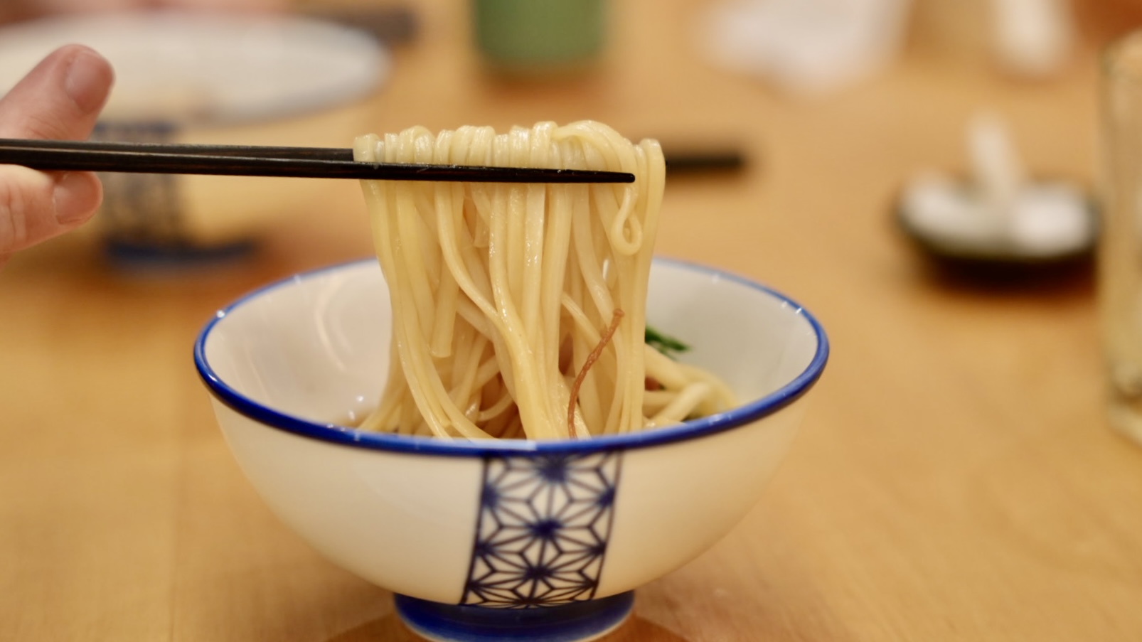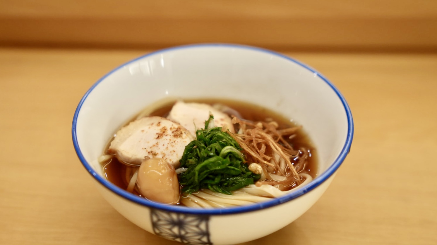 最後食事是以「雞肉烏龍麵」呈現,麵條選擇日本細長的烏龍麵,麵條很Q彈,湯頭的部分充滿炭火香氣,以面有炸金針菇、炭火炒過的蒜苗,非常特別的還有一顆鵪鶉蛋製成的溏心蛋。