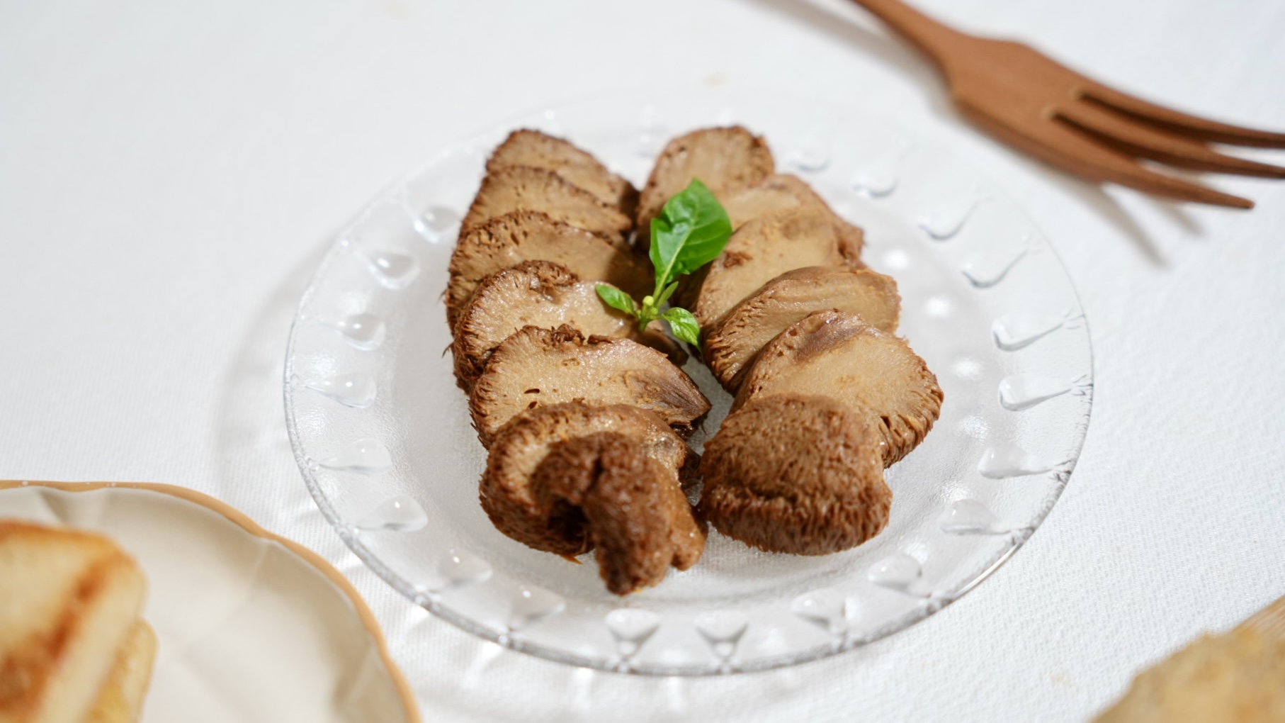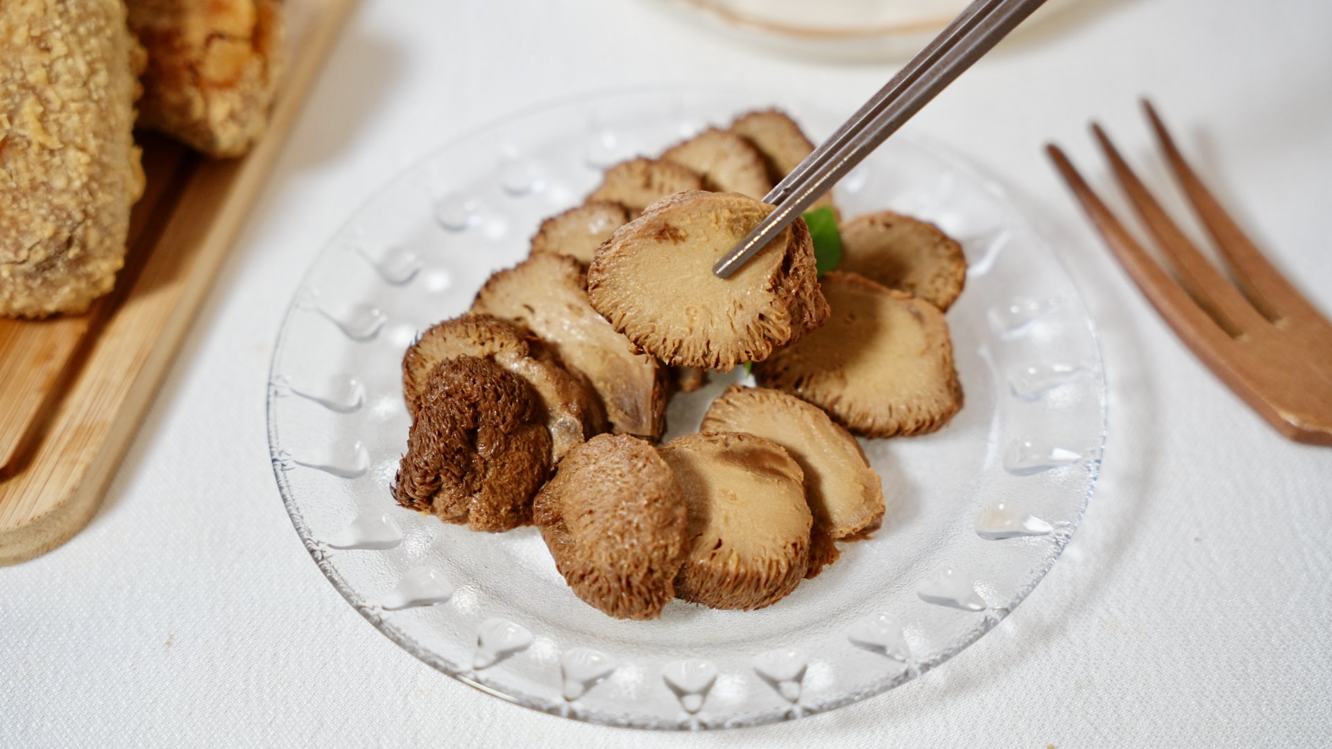 我們全家人最愛的「燻珍猴菇排」,直接退冰切片就能享用,醬香入味非常美味,口感Q彈很像鮑魚呢!