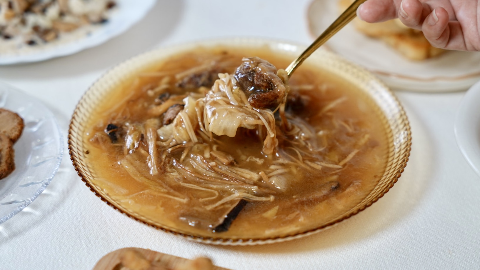 過年年菜一定要有一道羹,鈺善閣年菜特別推出「國宴猴菇鈺翅羹」,裡面有滿滿的白菜、金針菇、杏鮑菇、猴頭菇,羹湯喝起來鹹香,尾韻帶出醋酸甘甜的味道~